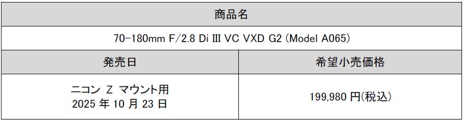 総合光学機器メーカーの株式会社タムロン(代表取締役社長:桜庭省吾、本社:さいたま市)は、「ニコン Z マウントシステム」対応、フルサイズミラーレス一眼カメラ用大口径望遠ズームレンズ「70-180mm F/2.8 Di III VC VXD G2 (Model A065)」(以下70-180mm F2.8 G2)を2025年10月23日に発売します。