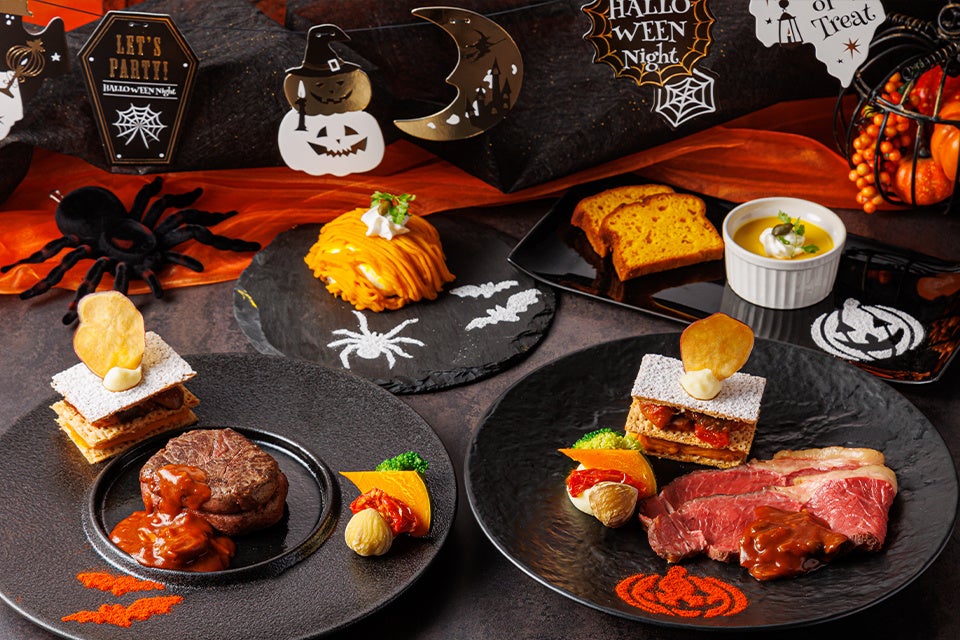 選べるメイン料理のうち、人気の高い「牛フィレ肉のステーキ シャスールソース」と「ローストビーフ シャスールソース」の2品が10月24日(月)から10月31日(月)までの8日間限定で、ハロウィンスタイルに変身します。
