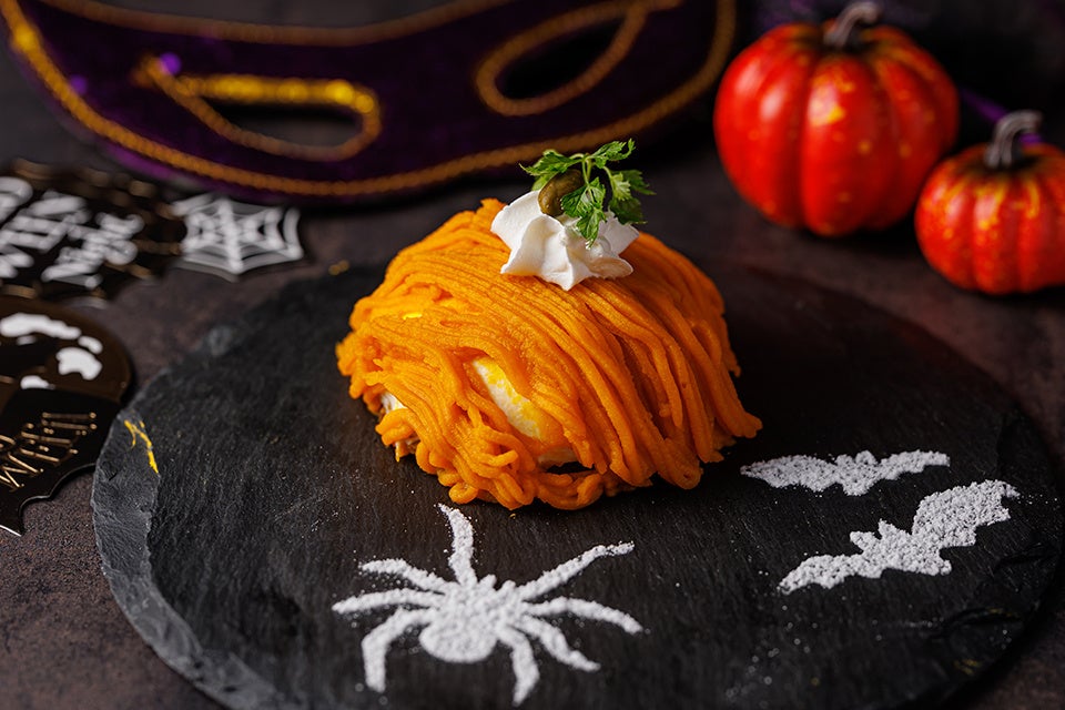 ジェノワーズ(スポンジ生地)とクリームババロアをひそませたモンブランの鮮やかなオレンジ色と黒いお皿、粉糖でデコレーションした蜘蛛やコウモリのモチーフがハロウィンの妖しい雰囲気を醸し出す期間限定の一品です。