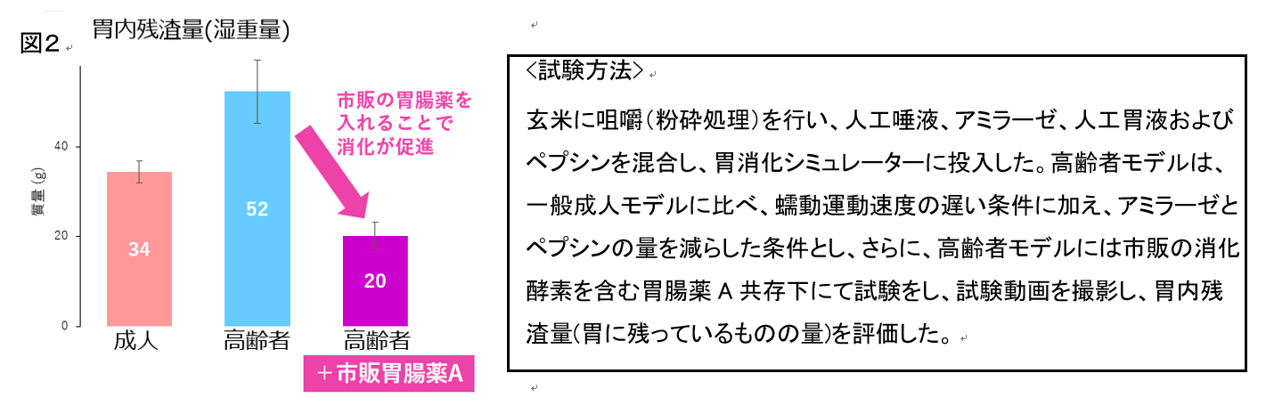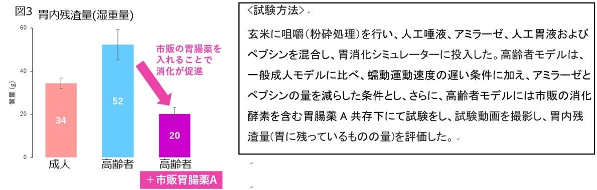 消化酵素を含む胃腸薬を用いて、高齢者モデルで玄米の消化能力を確認したところ、高齢者モデルの胃内残渣量は一般成人モデルよりも減少しました(図3)。これらの条件においては、消化酵素を含む胃腸薬が、加齢とともに衰えた高齢者の胃の消化能力をサポートするということが示唆されました。