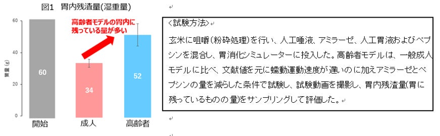 成人と高齢者の胃の消化能力を比較するため、胃消化シミュレーターを用い、高齢者モデル、および一般成人モデルの系を確立しました。その食材として、玄米を用いて可視化検証を行っています。その結果、消化終了時の胃内残渣量については、高齢者モデルは一般成人モデルに比べて約1.5倍残存していることがわかりました(図1)。これらの条件においては、高齢者は消化能力としては、一般成人に比べ、約2/3に落ちていることが示唆されました。