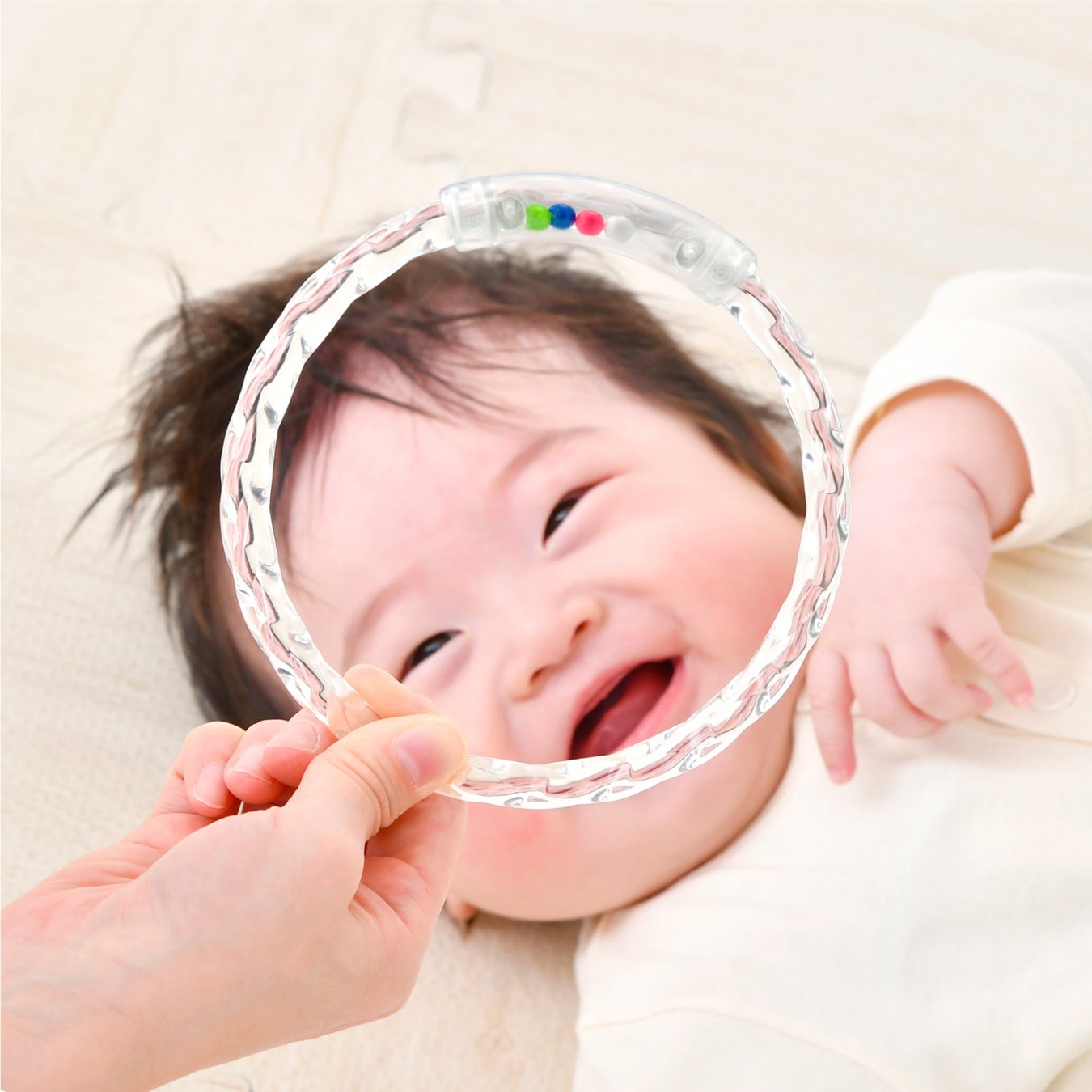 大人が思っている以上にまだ見えていない低月齢の赤ちゃんのための、特別なねじりが光を反射することで「見える」を楽しめるおもちゃ。