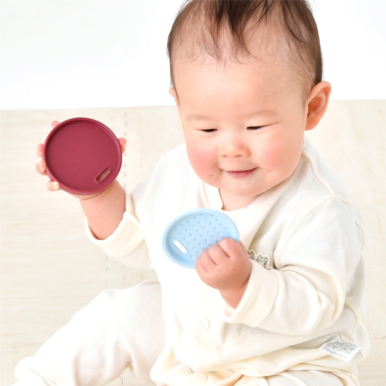 手先が器用になってきた赤ちゃんが特に執着する「軽くて丸いフタ」を研究。様々な遊び方を楽しめる4種類のディスクおもちゃ。