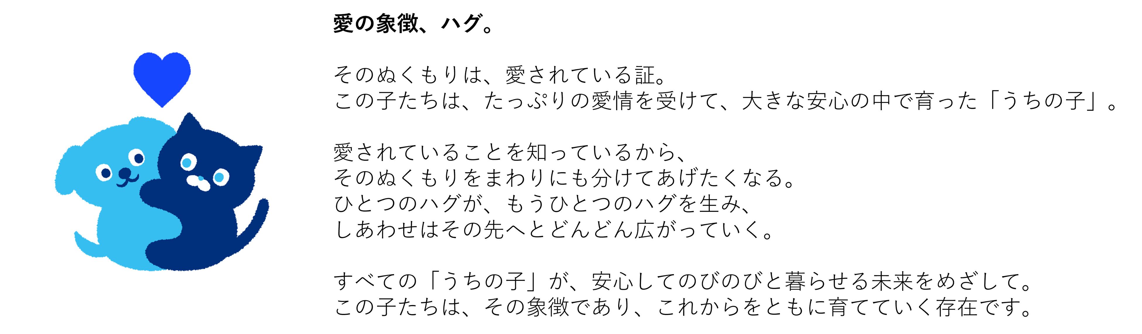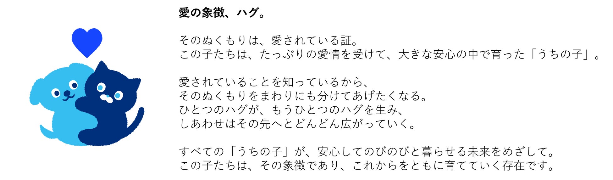 公式キャラクターは、当社のBrand Message 「うちの子に一生の愛を」をわかりやすく体現したものであり、コンセプトを以下のように『愛の象徴、ハグ。』としました。
