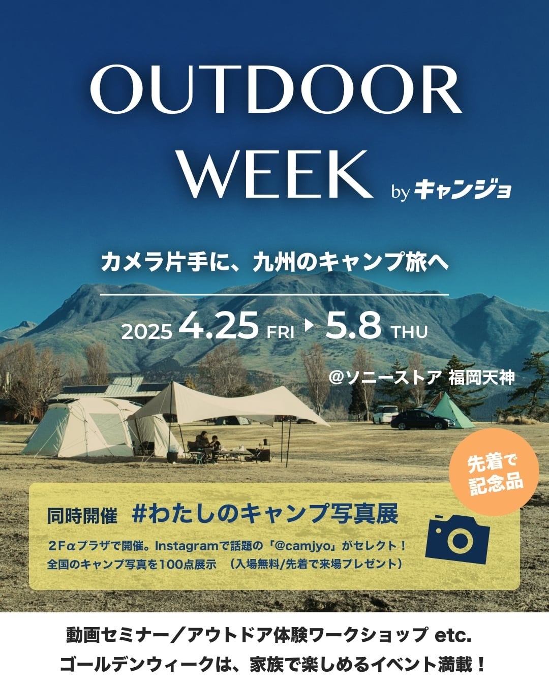 本イベントは、キャンプ女子株式会社とソニーストア 福岡天神が主催する「OUTDOOR WEEK by キャンジョ」の開催を記念して行われます。