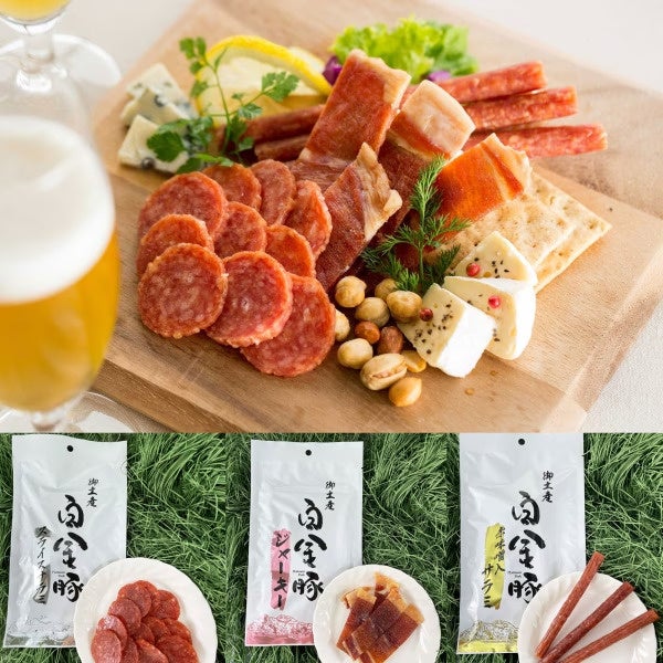 白金豚ポークジャーキー、白金豚の赤味噌入りサラミ、白金豚のスライスサラミのセットです。自家用はもちろんですが、お酒好きのあの方へ、家族も喜ぶ贈り物です。
