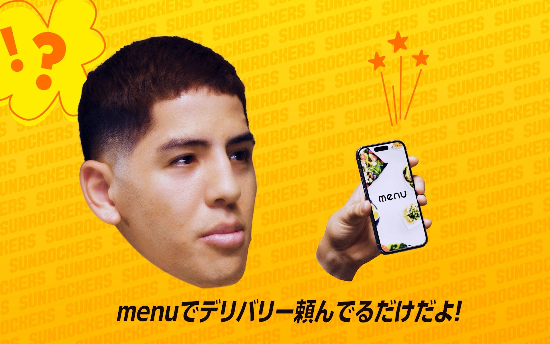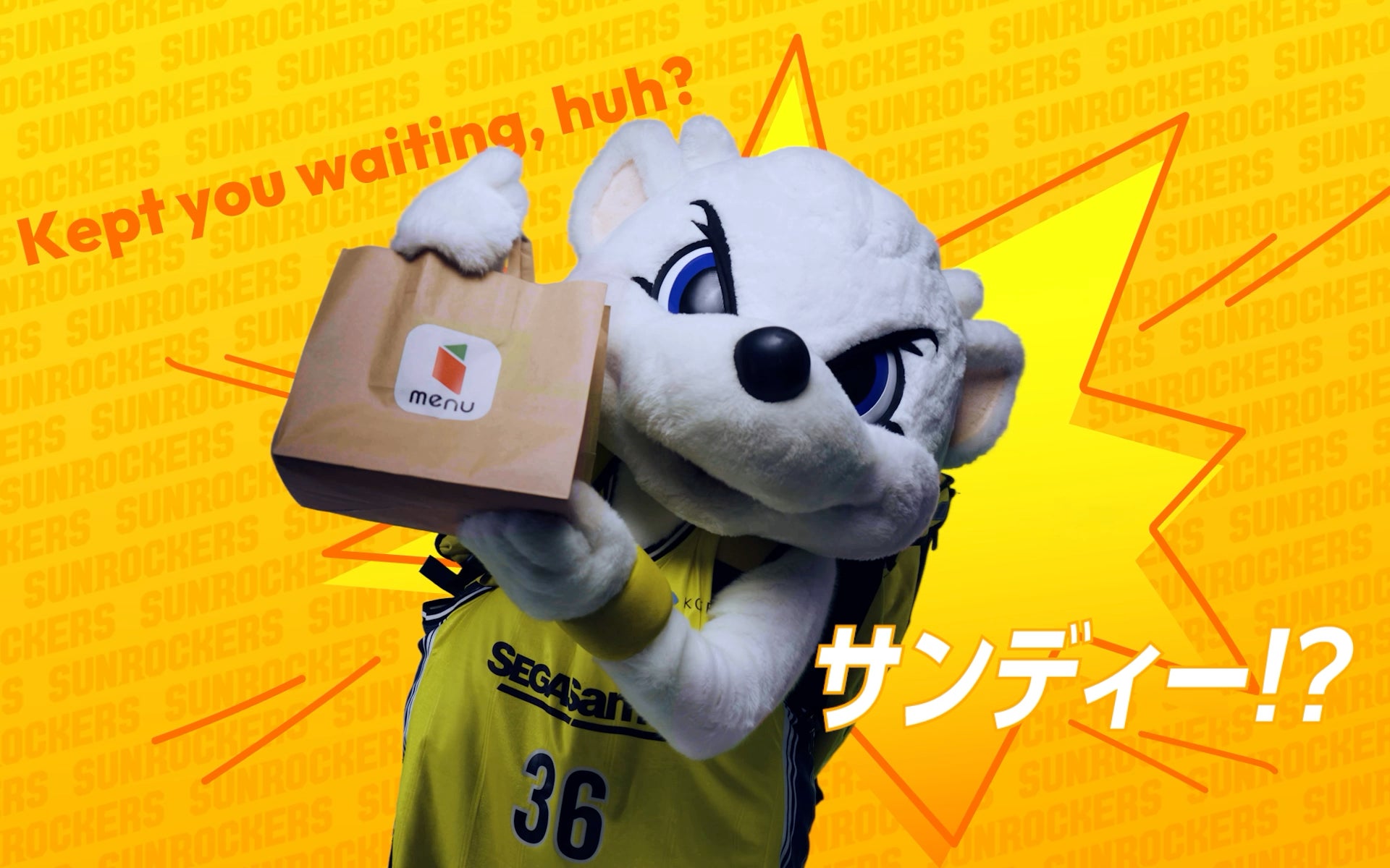 menuは2023-24シーズンより、サンロッカーズ渋谷のオフィシャルパートナーとして応援してきました。この度、2024-25シーズンのオフィシャルトップパートナーとして、会場内で放送するインフォマーシャルをオリジナルで制作しました。動画にはジョシュ・ホーキンソン選手、ベンドラメ 礼生選手、小島 元基選手が出演。3選手が楽しそうにmenuでグルメを注文したところに、サンロッカーズ渋谷のマスコットキャラクターであるサンディーがmenuクルーとしてグルメを配達してくる様子をコミカルに描きました。