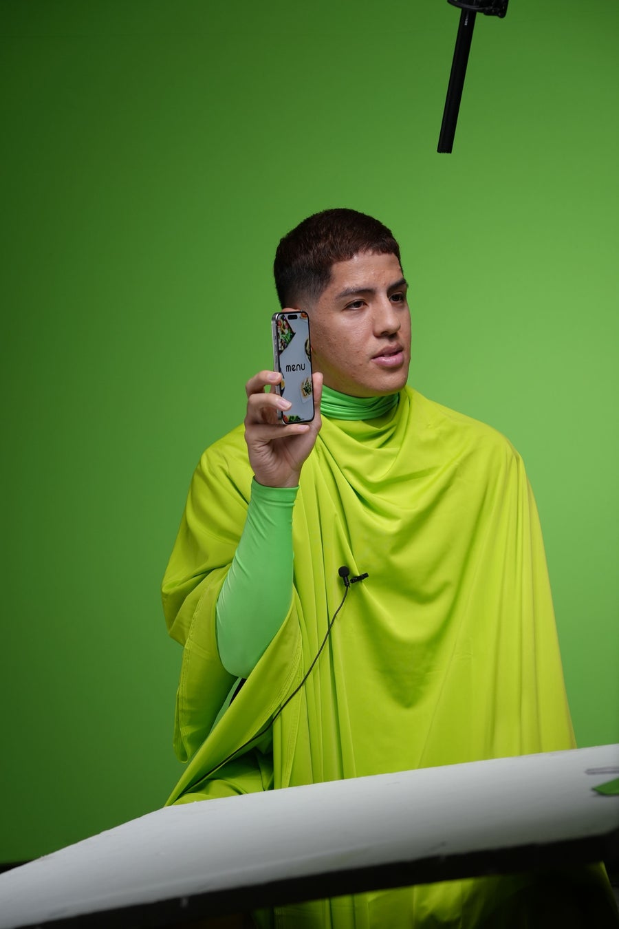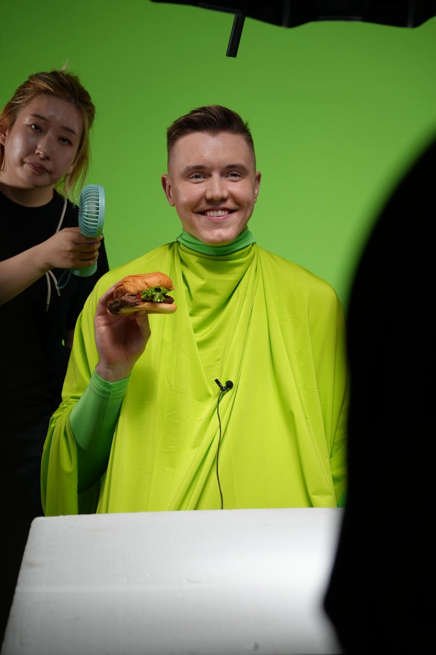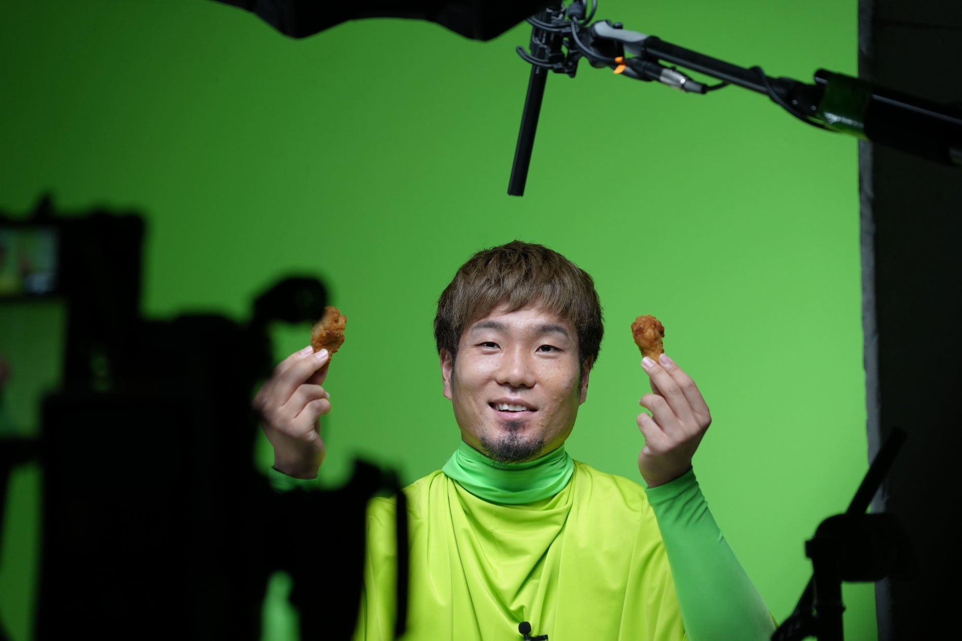 今回、アニメーションでポップな動きを出すためにグリーンバックの前で撮影。選手には布で身体を隠し、顔だけ出すという貴重な風景を見ることができました。