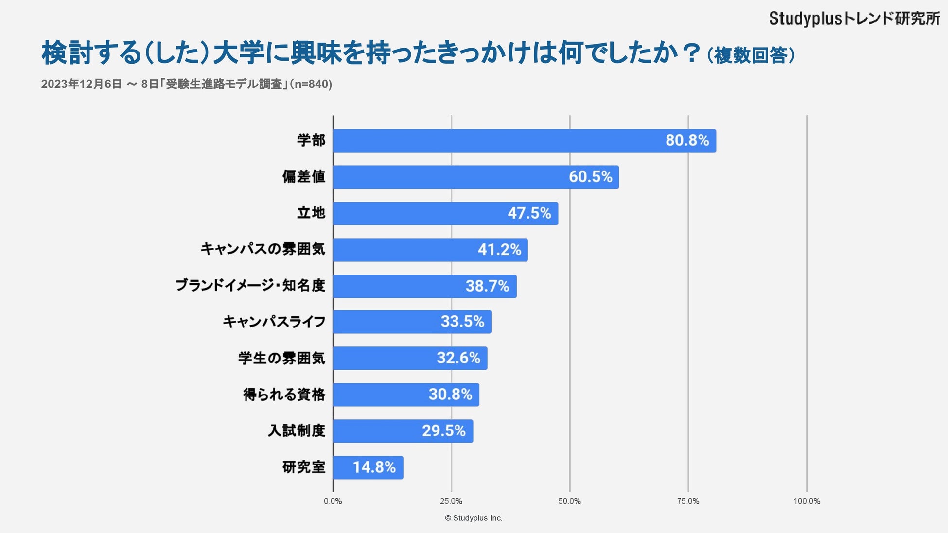 受験生の多くが認知している大学の数は二桁である一方で、「比較・検討」ステップでは「1~3大学」「4~6大学」程度に絞り込まれていることがわかりました。検討先として興味を持つに至った理由は「学部」(学びの内容)が8割を占め、「偏差値」「立地」「キャンパスの雰囲気」といった項目も重要な要素となっていることがわかります。