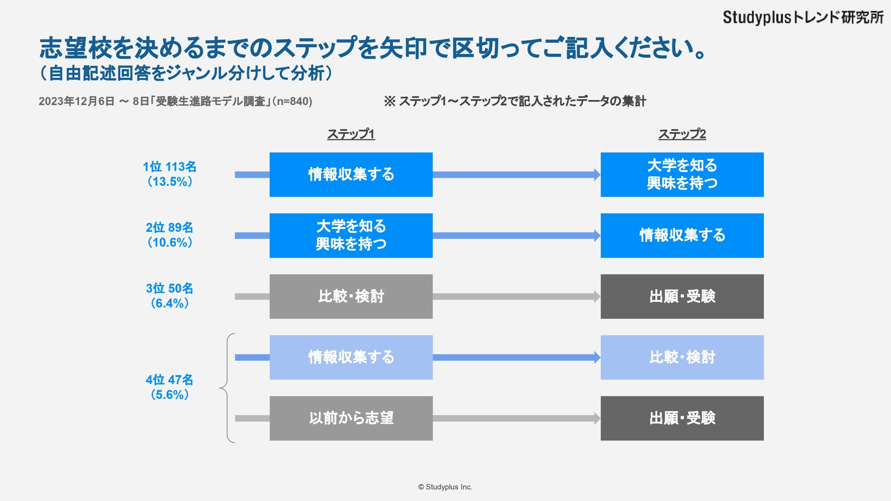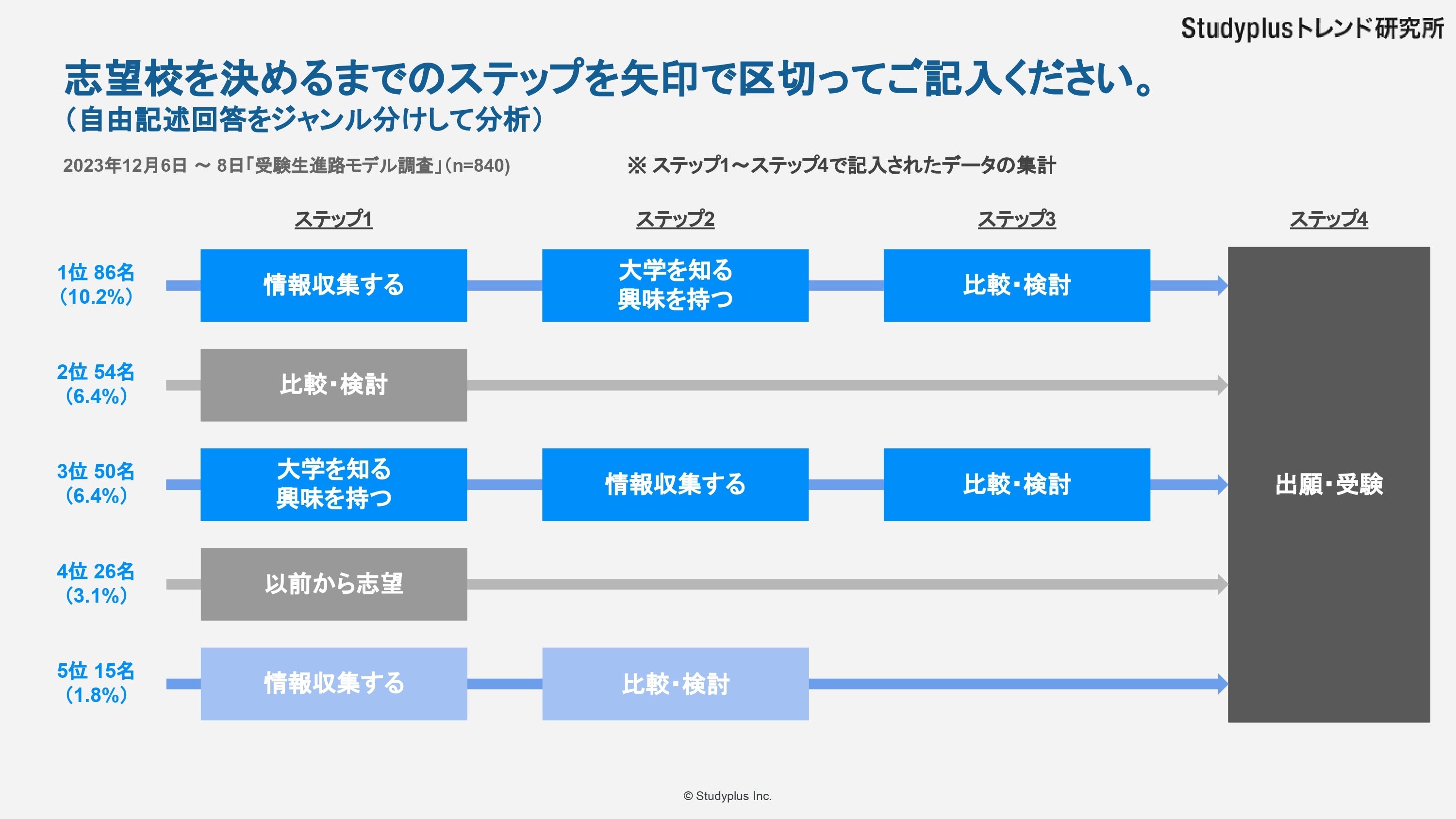 【調査項目】志望校を決めるまでのステップを矢印で区切ってご記入ください。(自由記述回答をジャンル分けして分析)