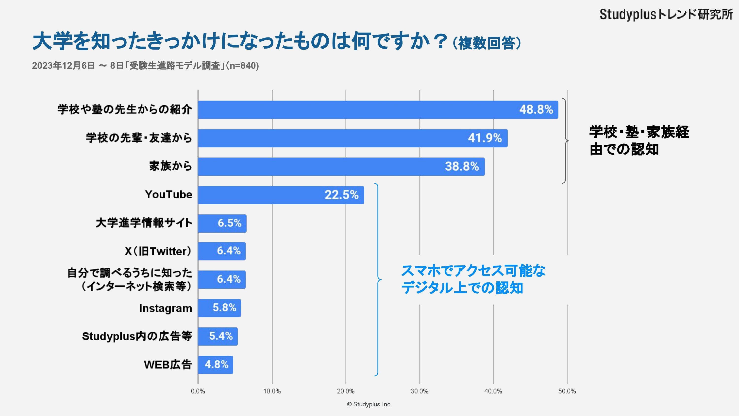 学校や塾の先生・友達や家族をきっかけに大学を知ることは昔から変わりませんが、YouTubeをはじめとしたデジタル上で多くの受験生が大学を認知しており、この傾向は “スマホ時代”ならではです。Studyplusトレンド研究所では、今後の受験生向けマーケティングにおいて、デジタル上でいかに受験生からアテンションを獲得するかが重要だと考えております。