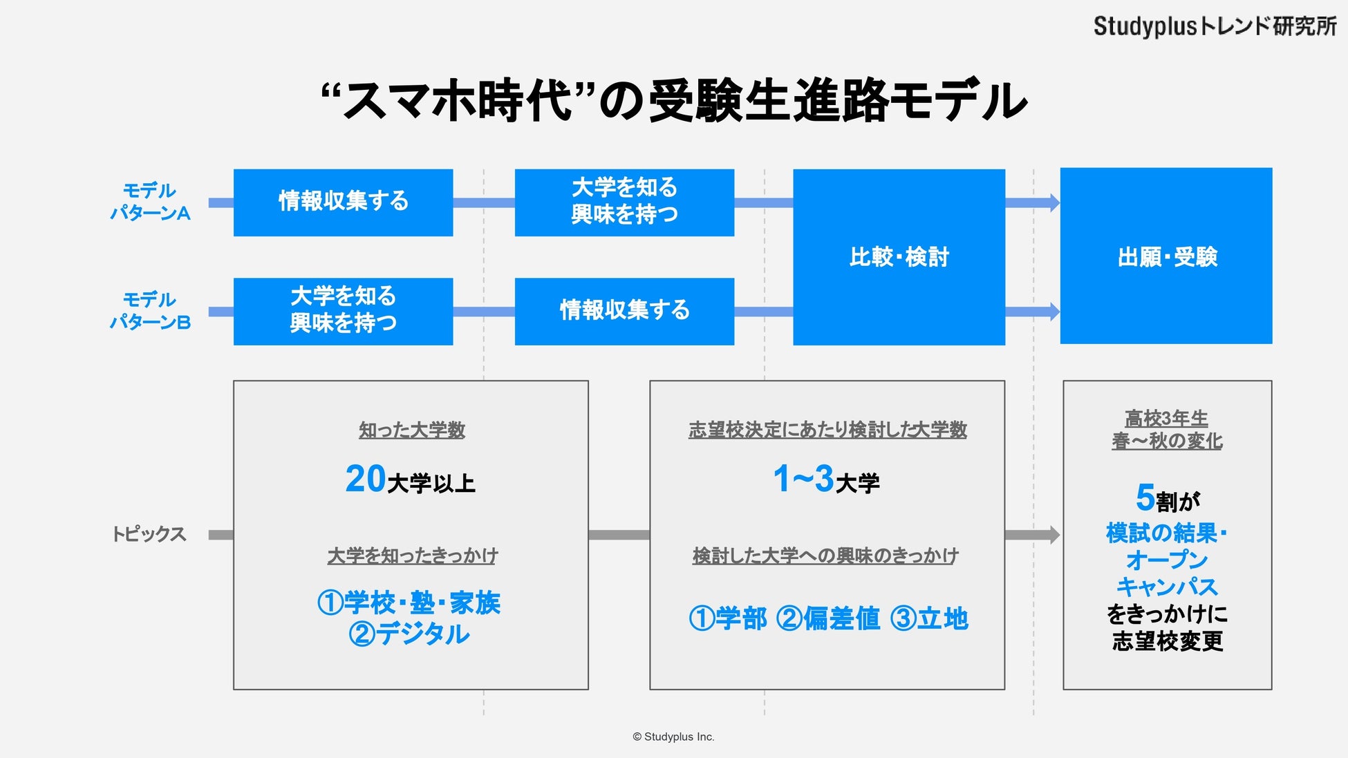 Studyplusトレンド研究所では、高校生の間でスマートフォン・SNSが普及し、日常生活の中で「大学を知る・興味を持つ」機会が増えたことで、モデルパターンBに繋がっていると考えております。