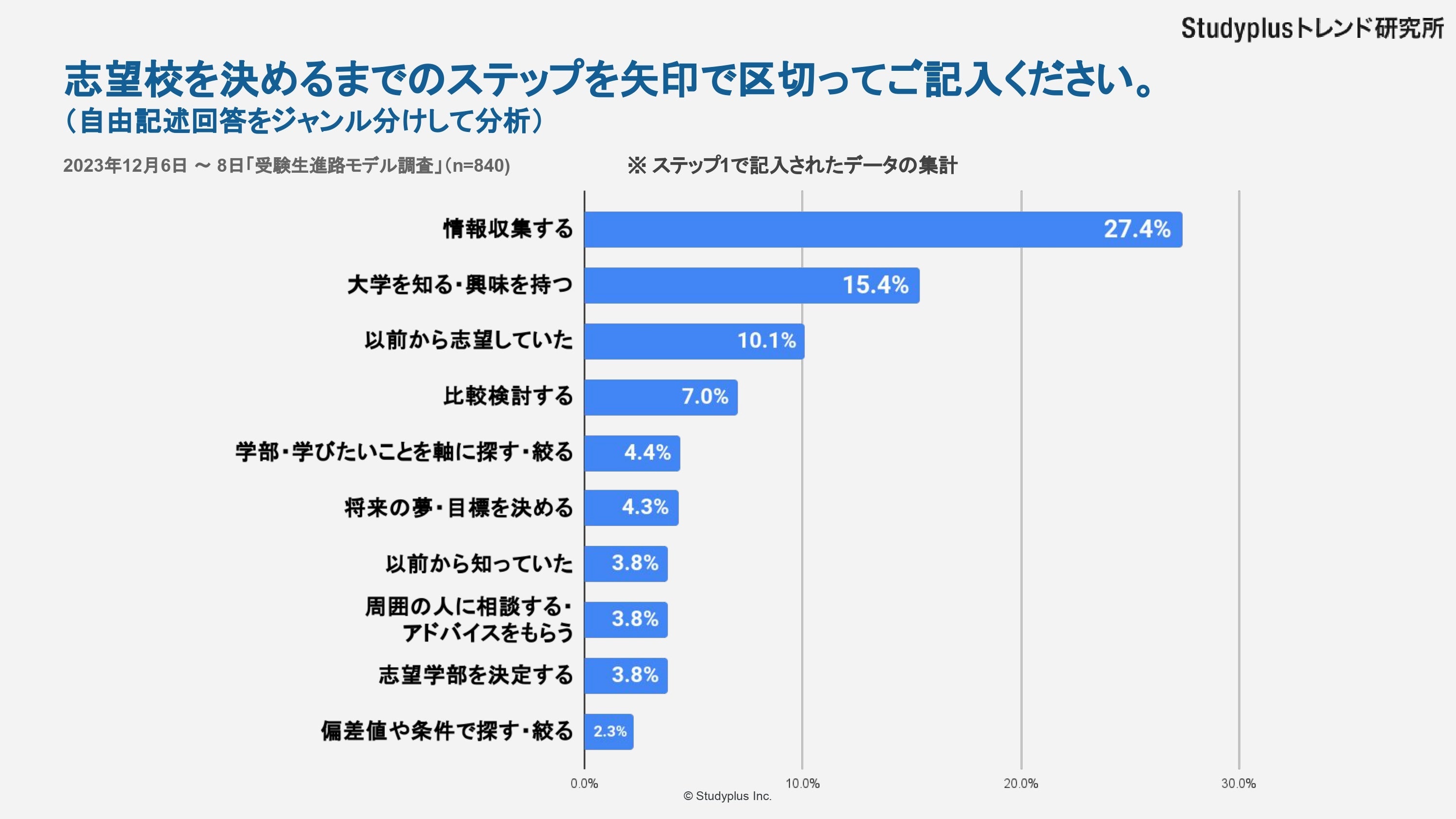 【回答】大きく2つのパターンが見られており、「情報収集する」からスタートする割合が最も多く全体の27.4%。次いで「大学を知る・興味を持つ」からのスタートで割合は15.4%。