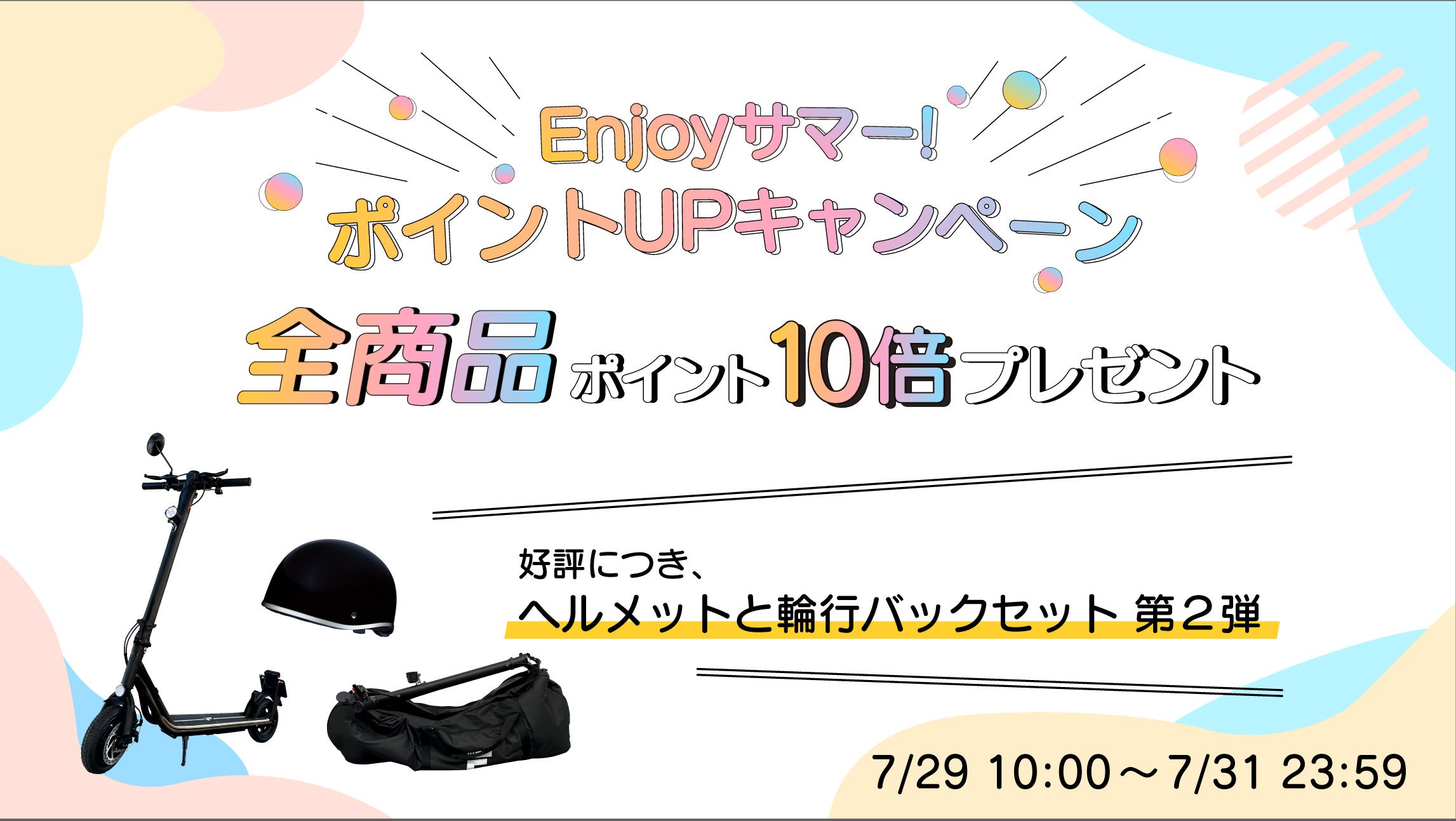7月29日10時から3日間限定!楽天Show itは、大好評の電動キックボードを購入でヘルメットと輪行バックプレゼントキャンペーン第2弾を実施、楽天サマーポイントアップでポイント10倍プレゼント。