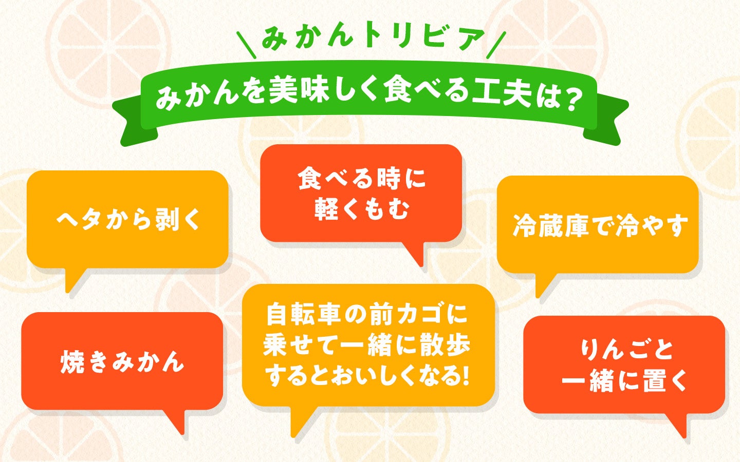 産直アウルユーザーに対してみかんを美味しく食べるための工夫を尋ねると、手で揉んだりコロコロしたり、刺激を与えてから食べるという回答が多くみられました。甘くするために「りんごと一緒に置く」という工夫や、「自転車の前カゴに乗せて一緒にお散歩するとおいしくなる!」という珍回答も。自転車のかごに入れて振動を与えることで甘みを増やすことに繋がるようです。