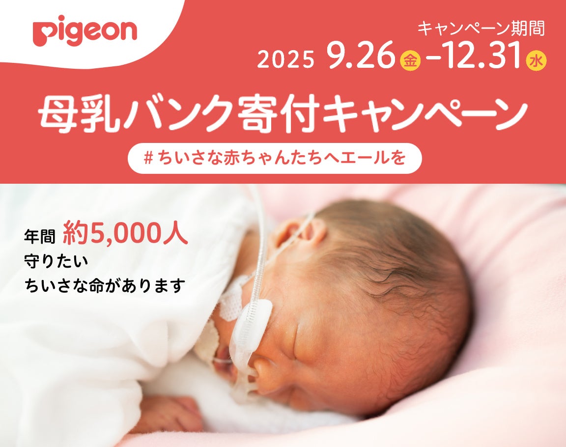 ピジョン株式会社(本社:東京、社長:矢野 亮)は、専門的なケアが必要な赤ちゃんとご家族向けの支援活動「ちいさな産声サポートプロジェクト」の一環として、一般社団法人 日本母乳バンク協会(代表理事:水野 克己)の活動に賛同し、ゴールドスポンサーとして2020年から同協会の支援を開始しました。当社本社1階に「日本橋 母乳バンク」の開設を全面的にサポートしたほか、商品の売上の一部を寄付する本キャンペーンを6年連続で実施しています。今年の秋も株式会社赤ちゃん本舗の協力を得て、全国のアカチャンホンポとアカチャンホンポ オンラインショップ(https://shop.akachan.jp)にて「母乳バンク寄付キャンペーン」を9月26日(金)より開始いたします。また、ピジョン公式Xにて、1リポストにつき 10 円を当社から日本母乳バンク協会へ寄付するキャンペーンも実施いたします。