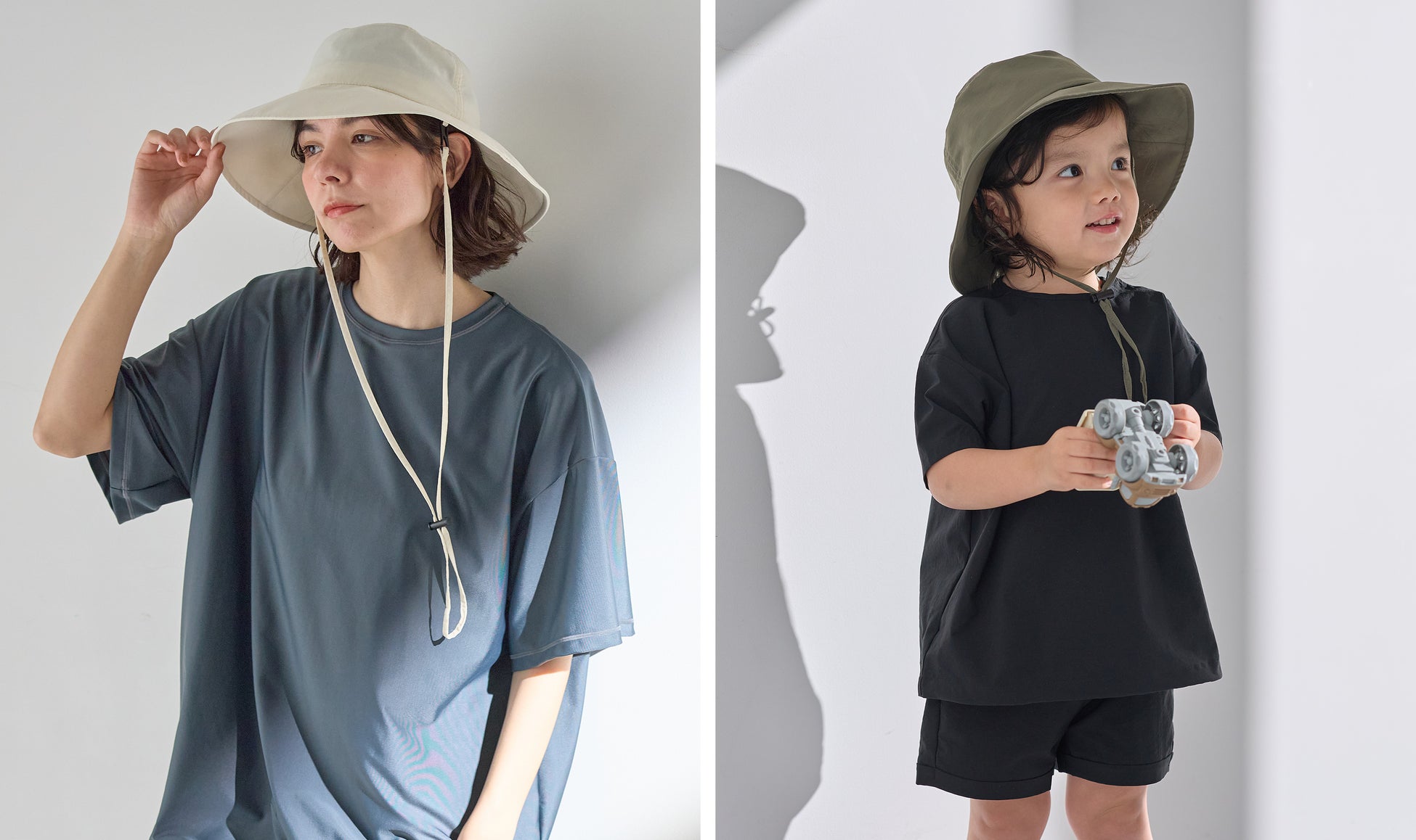 UVと撥水機能が付いたレジャーシーンにぴったりのハット。コードは取り外し可能なのも嬉しいポイント。キッズは後ろにドローコードが付いているので、サイズ調節が可能です。