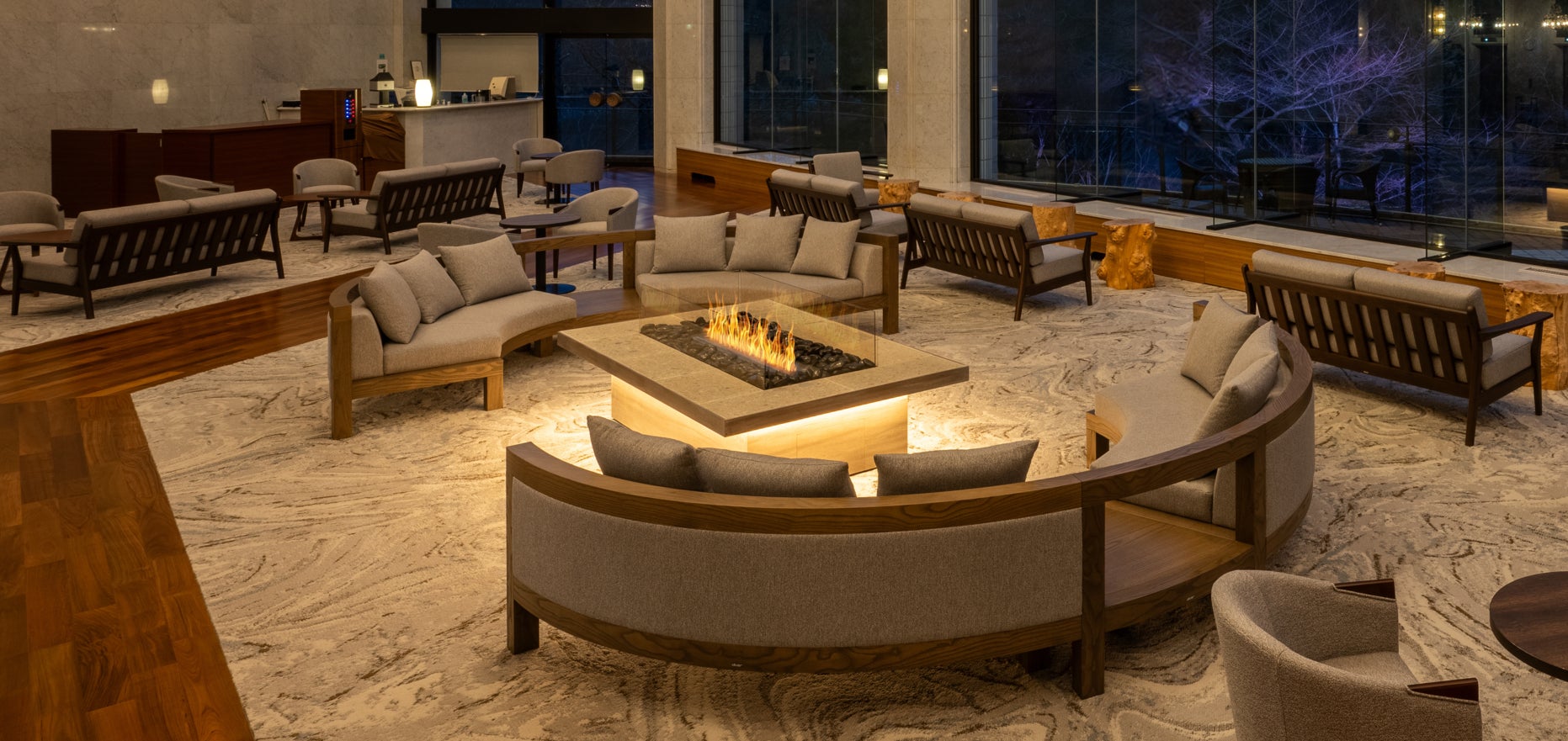 また、ソファとチェアの高さは従前の物よりも敢えて背が低いものを設えることで、お客様がホテルに入館された瞬間から、ガラスの向こうに広がる迫力ある自然を感じて頂けるよう仕上げました。