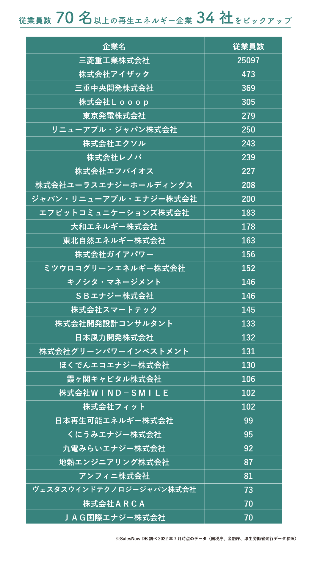 - 従業員数70名以上の再生エネルギー企業34社の中から企業をピックアップ