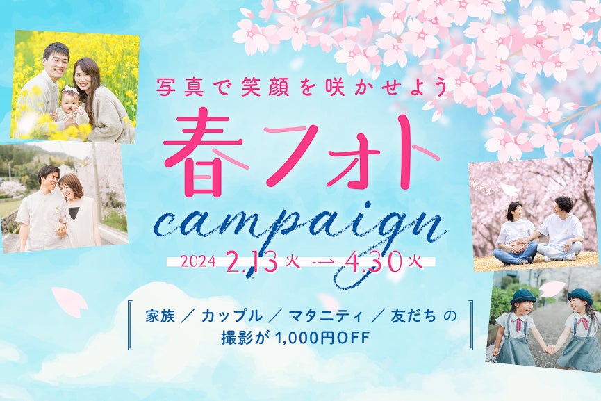 さらに同期間中に開催する「写真で笑顔を咲かせよう!春フォトキャンペーン2024」では、「家族」「カップル」「マタニティ」「友だち」ジャンルの撮影を予約された方を対象に、撮影料金が1,000円OFFになるキャンペーンを開催いたします。