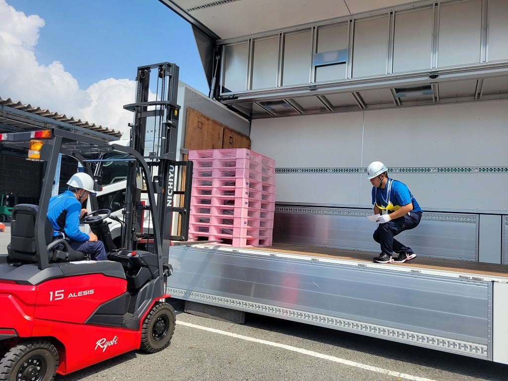 トラック・フォークリフト合体競技では、発生したトラブルに対してドライバーとリフトマンがどのように対応するのか、実務での経験を活かした対応を審査。