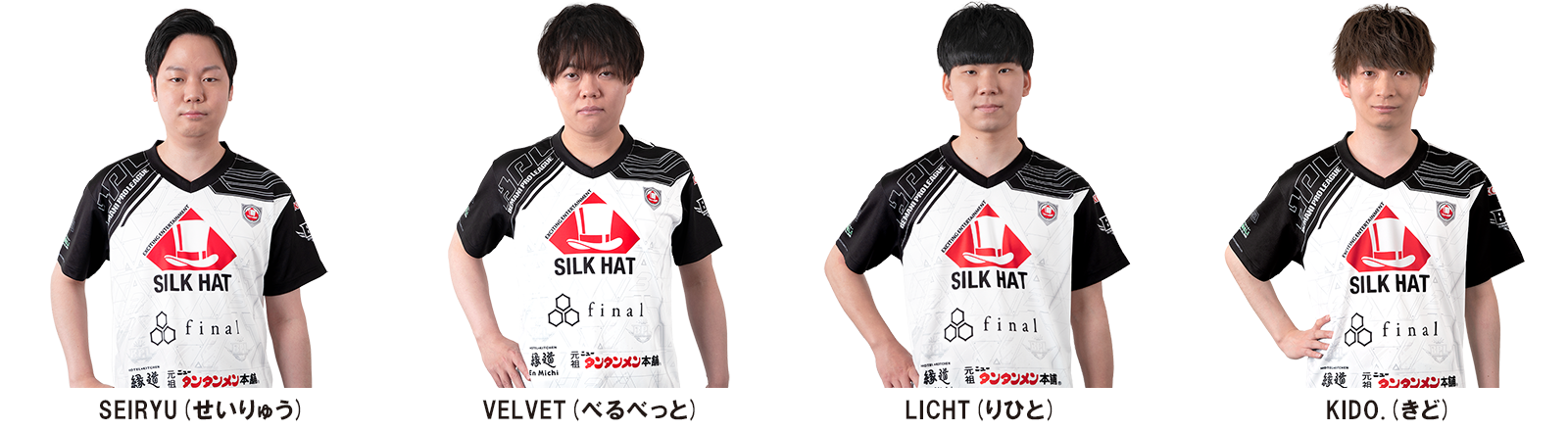 『BEMANI PRO LEAGUE -SEASON 3- beatmania IIDX』でのTEAM SILK HATは、前シーズンから引き続きのSEIRYU選手、KIDO.選手に加えて、新たにVELVET選手、LICHT選手を迎え、それぞれの実力はもちろん、『SILK HAT』らしいチームワークが発揮できる強力なチームとなりました。