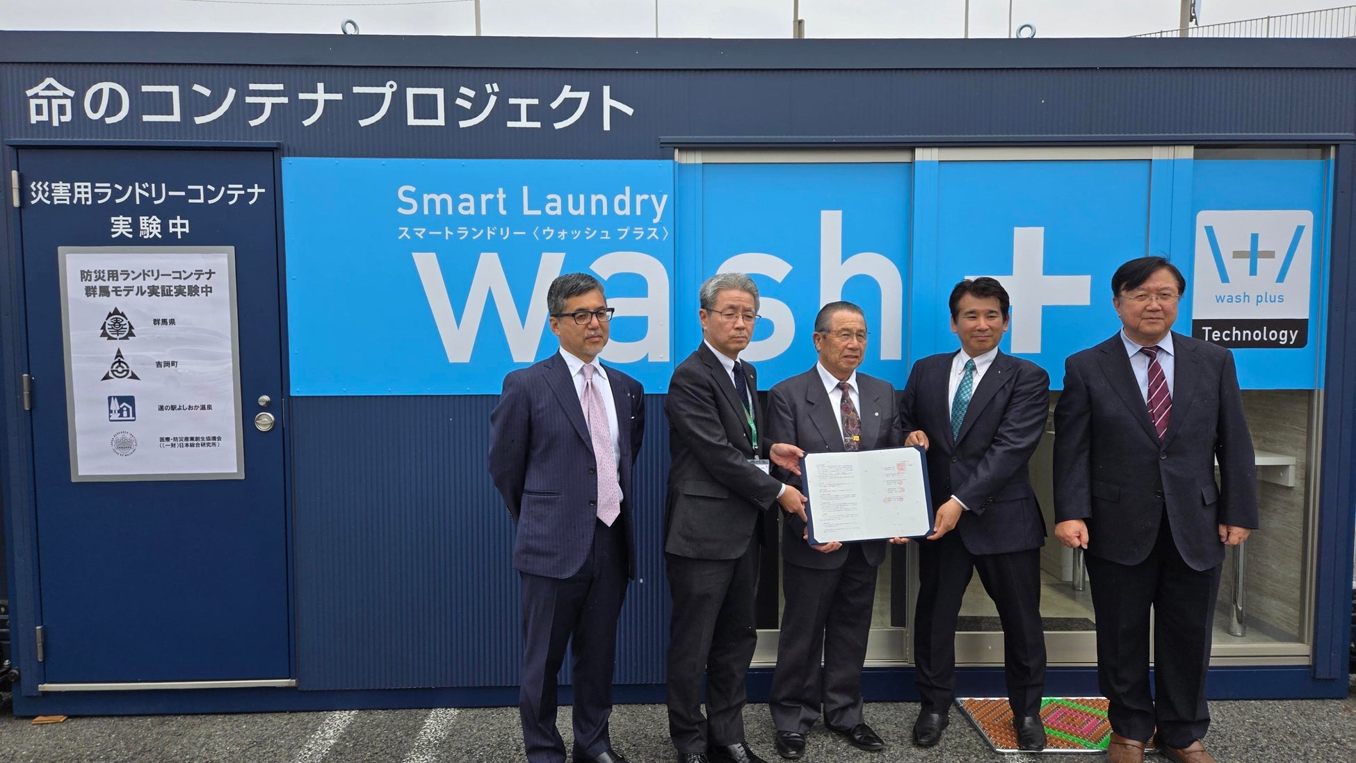 株式会社wash-plus(本社:千葉県浦安市、代表取締役:高梨健太郎)は、群馬県、吉岡町、株式会社吉岡町振興公社、一般財団法人日本総合研究所の5者で、水循環型洗濯機の社会実装に向けた実証実験を、道の駅よしおか温泉で開始しました。4月10日(金)には現地にて開始式がおこなわれました。