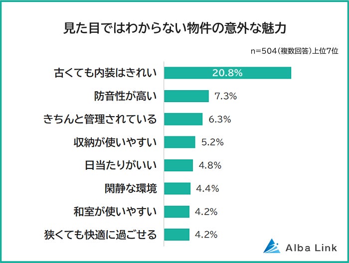 「見た目ではわからない物件の意外な魅力」を聞いたところ、1位は「古くても内装はきれい(20.8%)」でした。外観の見た目からではわからない、内装のきれいさを挙げた人が多数。