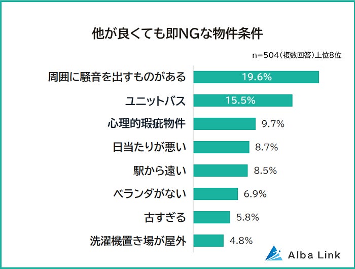 「他が良くても即NGな物件条件」を聞いたところ、最も多かった回答は「周囲に騒音を出すものがある(19.6%)」でした。2位「ユニットバス(15.5%)」、3位「心理的瑕疵物件(9.7%)」が続きます。