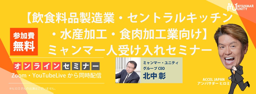 「ミャンマー・ユニティ」は、5月16日(木)に開催した「【飲食料品製造業・セントラルキッチン・水産加工・食肉加工業向け】ミャンマー人受け入れセミナー」動画を無料公開