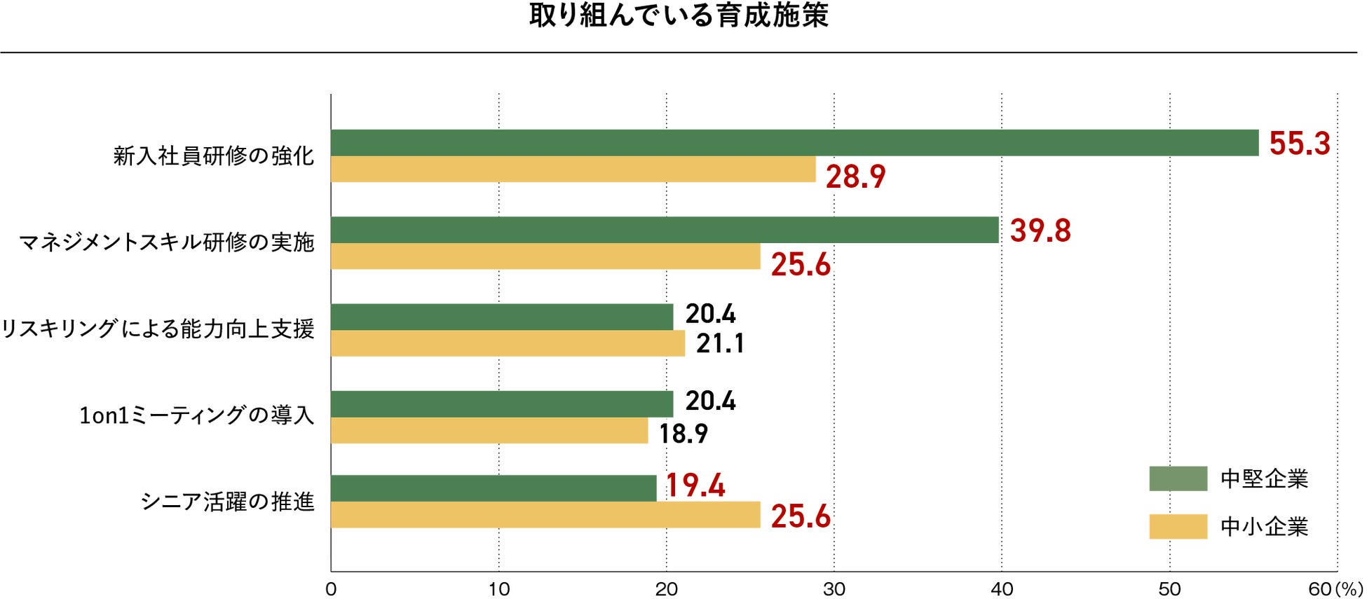 取り組んでいる育成施策では、いくつかの項目において顕著な差が見られました。中堅企業では55.3%が新入社員研修の強化に注力しており、若手人材の育成に積極的な姿勢が見てとれます。一方、中小企業では同項目が28.9%にとどまっています。この差は、中堅企業が新卒採用に成功し、若手育成に力を入れている一方で、中小企業が新卒採用に苦戦している現状を示していると考えられます。