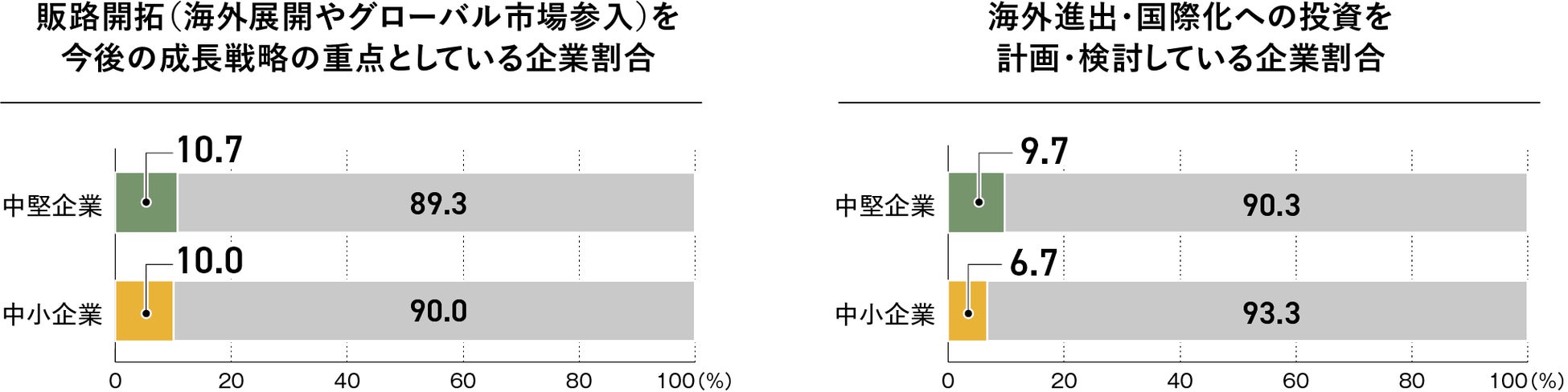 海外展開やグローバル市場参入などの販路開拓を今後の成長戦略の重点としている企業は、中堅企業で10.7%、中小企業で10.0%と低い割合に留まる結果となりました。同様に、海外進出・国際化への投資を計画・検討している企業も中堅企業で9.7%、中小企業で6.7%と少数派であることが分かりました。