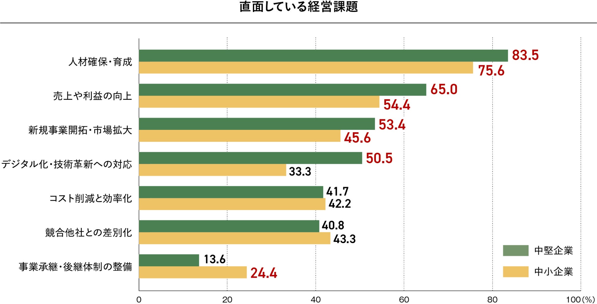 中堅・中小企業が直面している主要な経営課題が明らかとなりました。最も顕著な課題は「人材確保・育成」であり、中堅企業の83.5%、中小企業の75.6%が回答しています。次いで「売上や利益の向上」(中堅企業65.0%、中小企業54.4%)、「新規事業開拓・市場拡大」(中堅企業53.4%、中小企業45.6%)となりました。