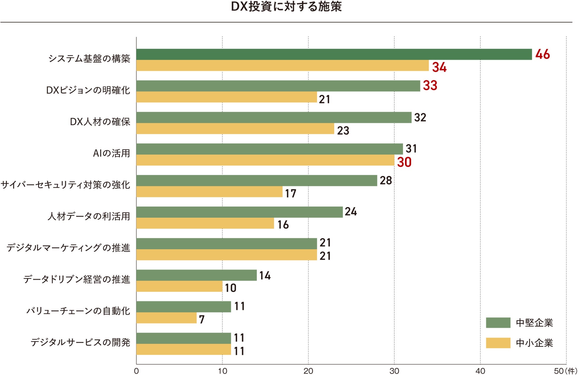 DX投資に対する具体的な施策を見てみると、「システム基盤の構築」が両者ともに最多となり、中堅企業で46件、中小企業で34件となりました。両者に共通する最重要項目となっていることが分かります。