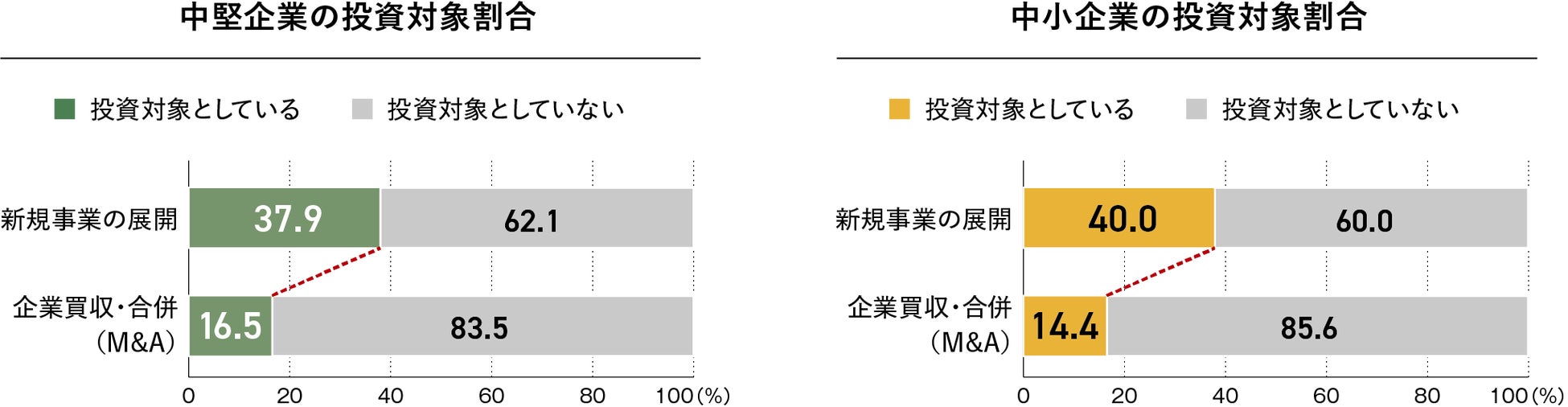一方、M&Aへの関心は低く、投資対象としているのは中堅企業で16.5%、中小企業で14.4%に留まりました。M&Aを自社の成長戦略として選ぶことが少ないことがうかがえます。