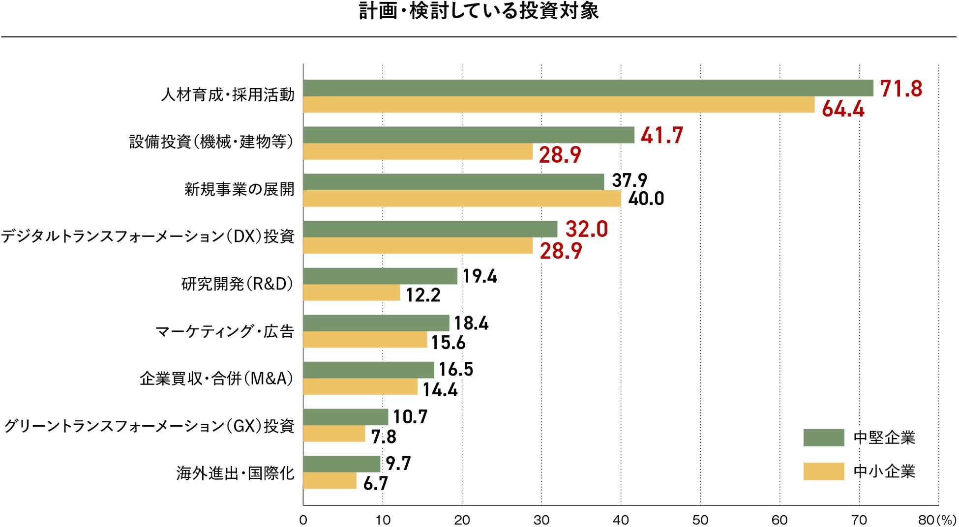 (1)投資対象は「人材育成・採用活動」が中堅企業で7割以上、中小企業で6割以上と最多!