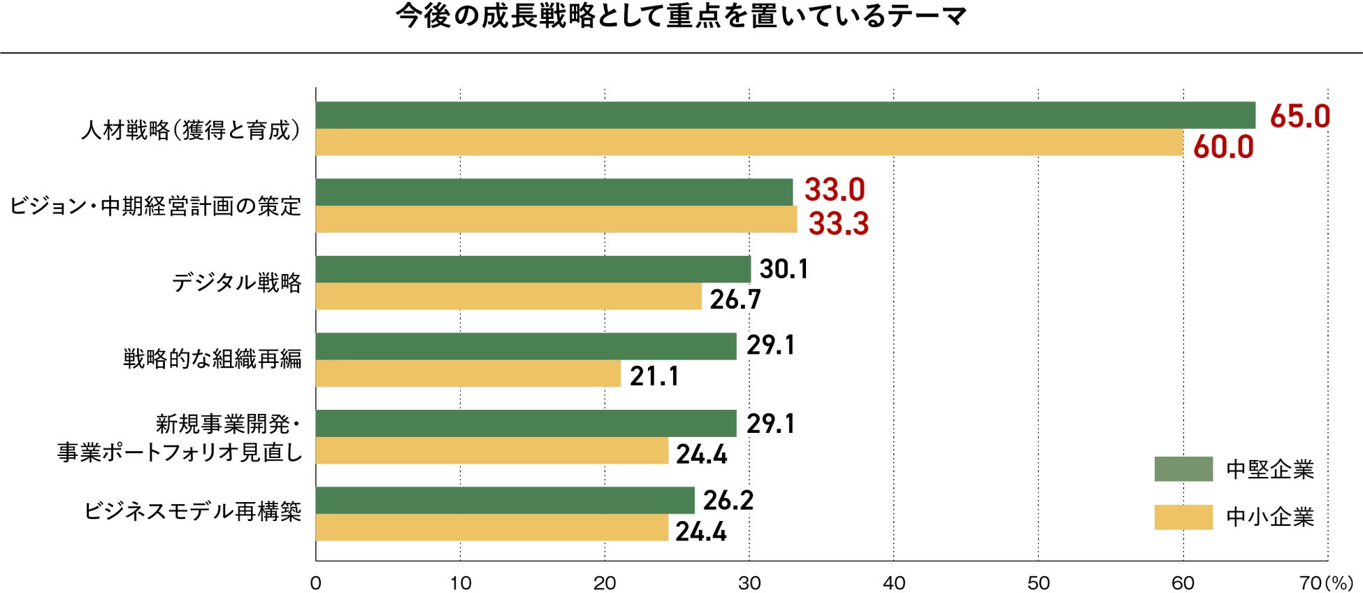 今後の成長戦略として重点を置いているテーマについては、「人材戦略(獲得と育成)」との回答が最多となり、中堅企業の65.0%、中小企業の60.0%という結果に。また、「ビジョン・中期経営計画の策定」(両者とも33%前後)も上位に位置し、長期的視点の重要性が認識されていることが分かります。