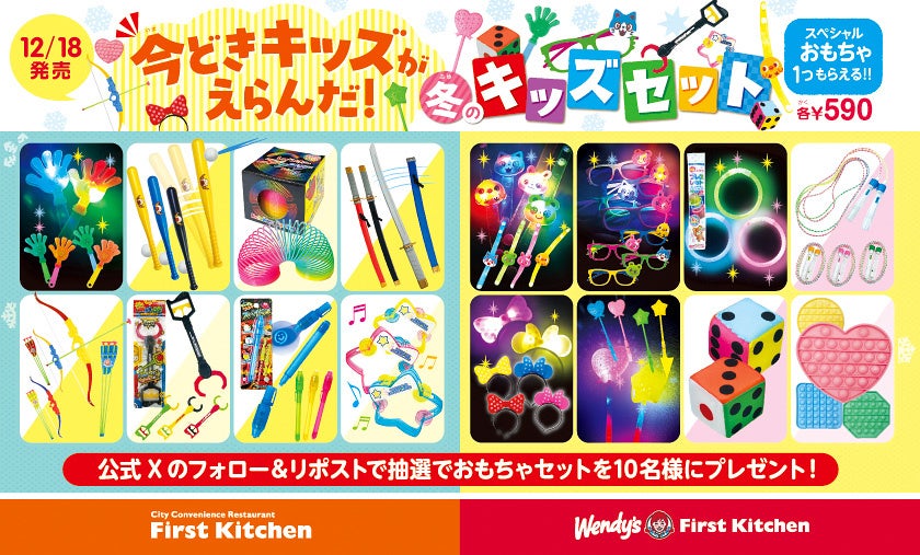 ウェンディーズ·ジャパン株式会社及び、ファーストキッチン株式会社 (所在地:東京都新宿区、代表取締役:紫関修) は、12月18日(水)から、ウェンディーズ· ファーストキッチンとファーストキッチンの対象店舗で、スペシャルキッズセットを販売します。今冬は、今どきキッズたちが選んだ、リアルに欲しいと思えるおもちゃがラインナップ!大人気ピカピカ光るシリーズや、身に着けて楽しめるおもちゃなどを取り揃えました。冬のわくわくはウェンディーズとファーストキッチンにお任せ!数に限りがありますので、お早めにご来店ください。また、12月17日(火)~1月5日(日)の期間中、ファーストキッチンの公式X(旧Twitter)アカウント(@FK_PR)をフォローし、対象ポストをリポストいただくと抽選で10名様に、スペシャルおもちゃセット(全16種)をプレゼントいたします。ぜひご参加ください!