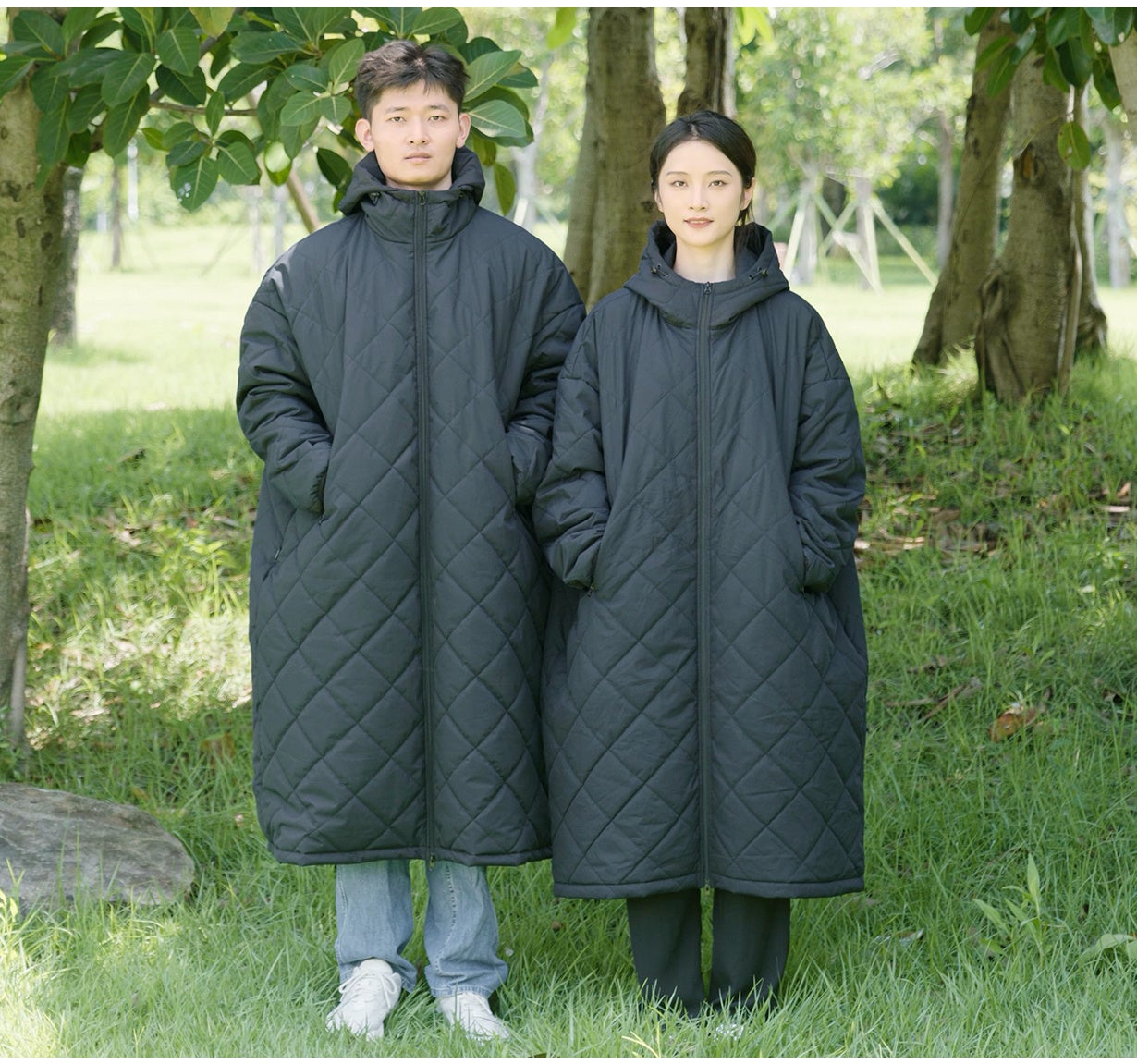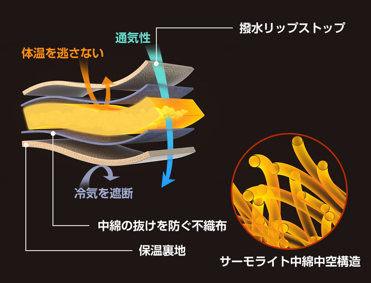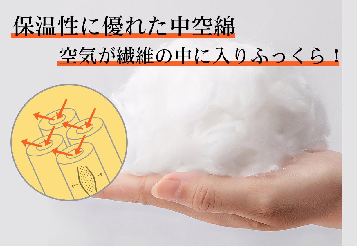 中綿は中空綿を採用しています。中空綿は空気の隙間を利用して断熱効果を高めます。一般的なポリエステル綿と比べ、中空綿は軽量でありながら優れた保温性を提供します。また、通気性にも富んでおり、湿気を逃がすことで快適な着用感を実現します。