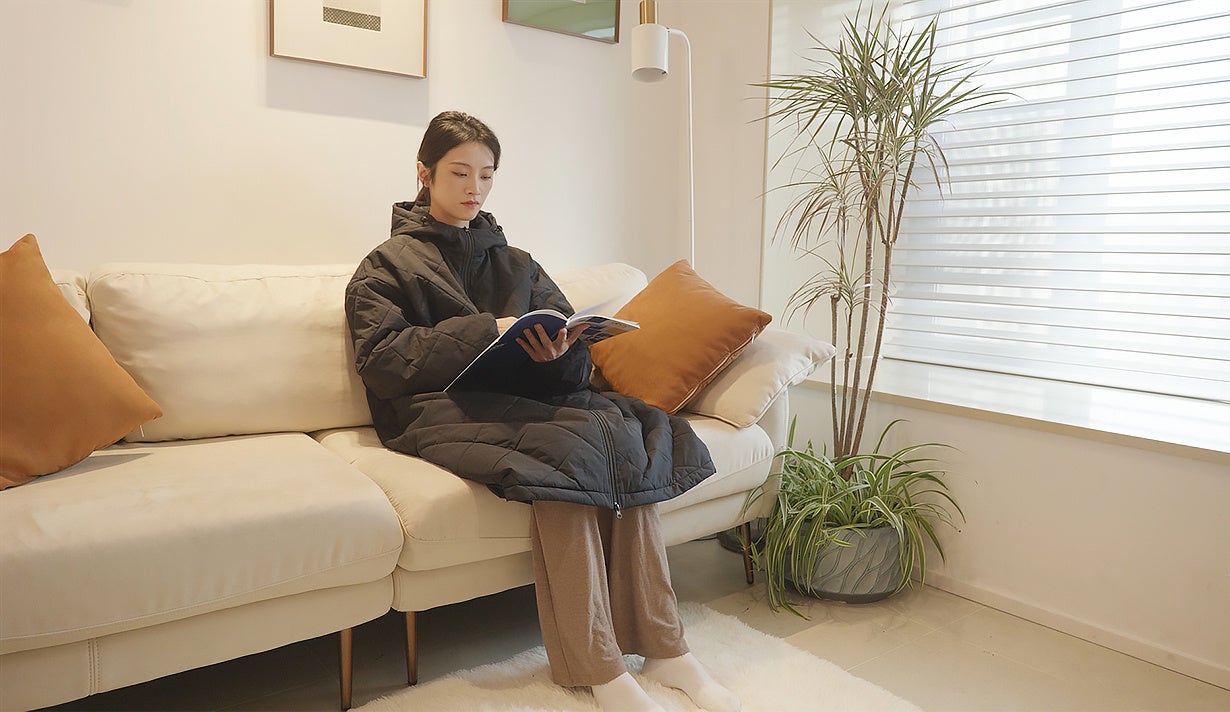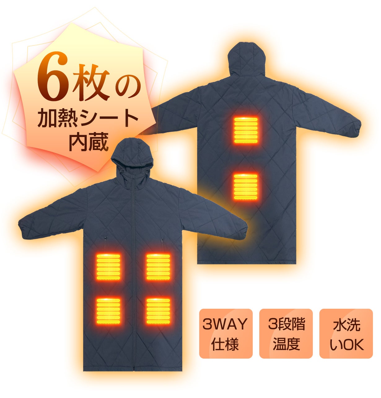 電気ヒーターをつけない場合:「RA01」は裏起毛仕様で、電気ヒーターつけなくても暖かいです。比較的に寒くない室内では大活躍してくれます。また、デザインはシンプルで色味も落ち着いているから、一般コートとしても使えます。通勤道の電車やバスなど暖房が付いている環境では電気ヒーターなしでも十分。