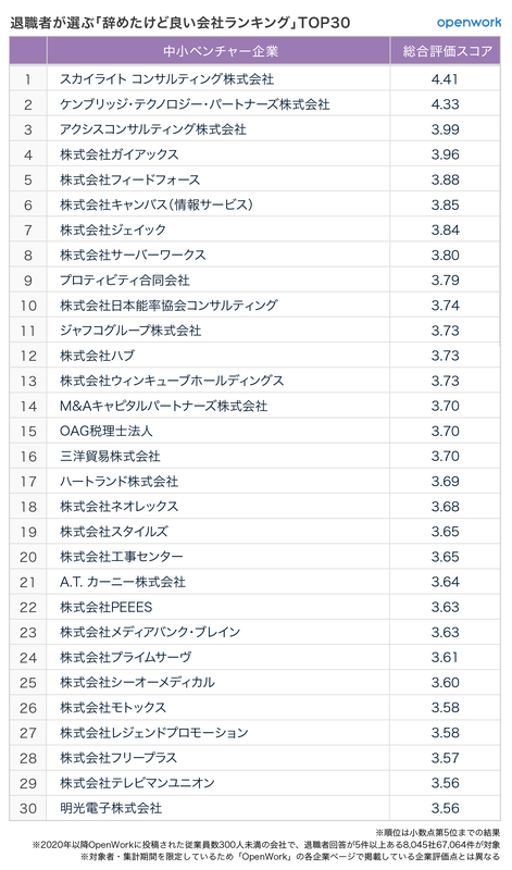 「退職者が選ぶ「辞めたけど良い会社ランキング」【中小ベンチャー企業編】」とは、OpenWork に投稿された社員クチコミのうち、従業員数が300人未満の企業の退職者による評価に限定し、退職者からの評価が高い企業を集計したランキングです。