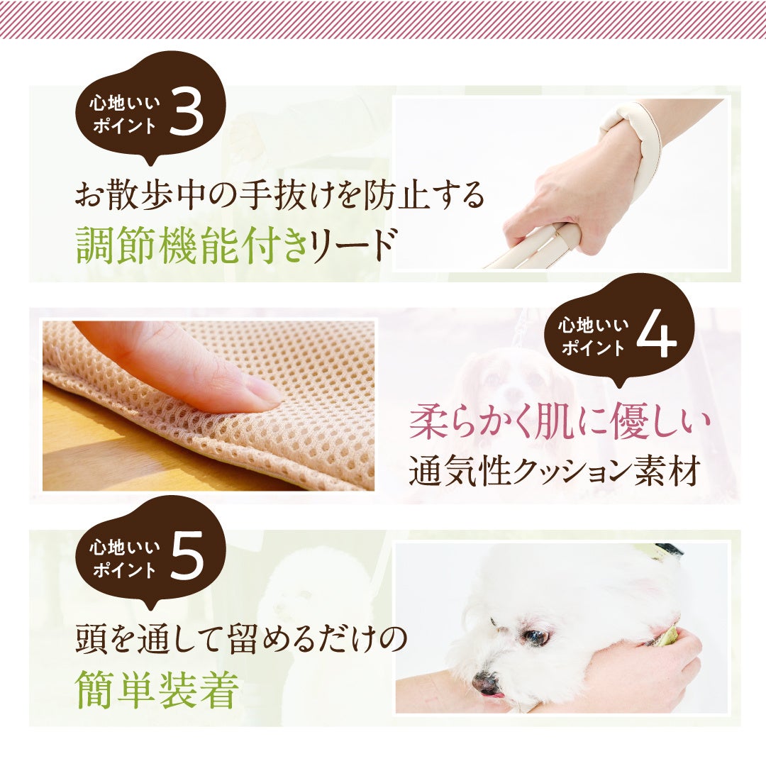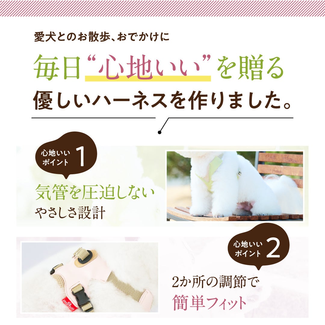 愛犬とのお散歩、おでかけに毎日”心地いい”を贈る優しいハーネスです。