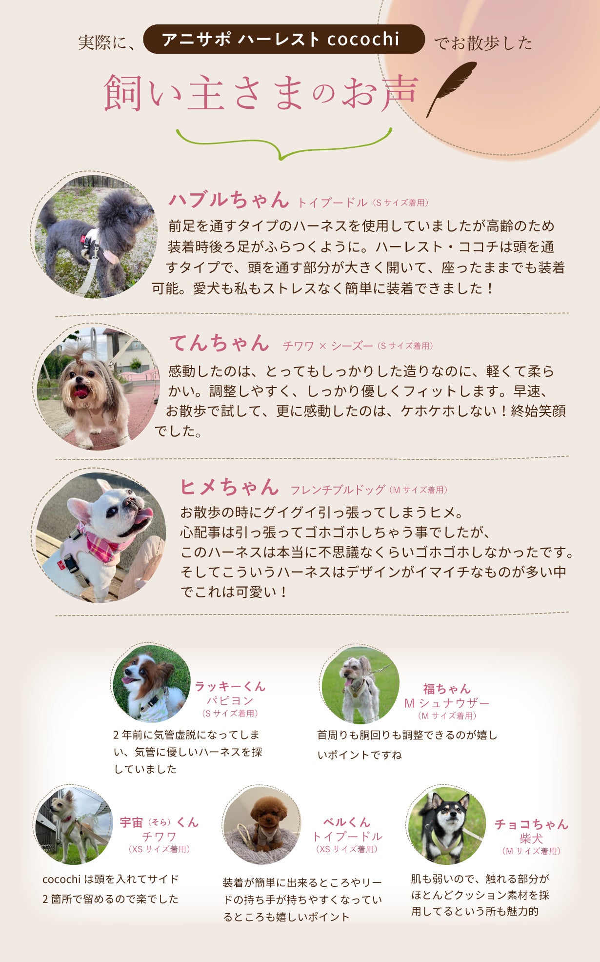 アニサポ ハーレスト cocochi の開発はとても難しく、素材の選定から縫製まで追求し、開発期間は2年にもわたります。アニサポハーレストの「気管にやさしい設計」は残しつつ、さらに機能性を追加したおしゃれなデザインの優しいハーネスになりました。多くのワンちゃんに試着をお願いし、何度も試作を重ね、細部まで゛心地いい”をこだわり抜いた製品です。是非、多くのワンちゃんにお散歩やお出かけを心地良く、健康に楽しんでいただきたいです。