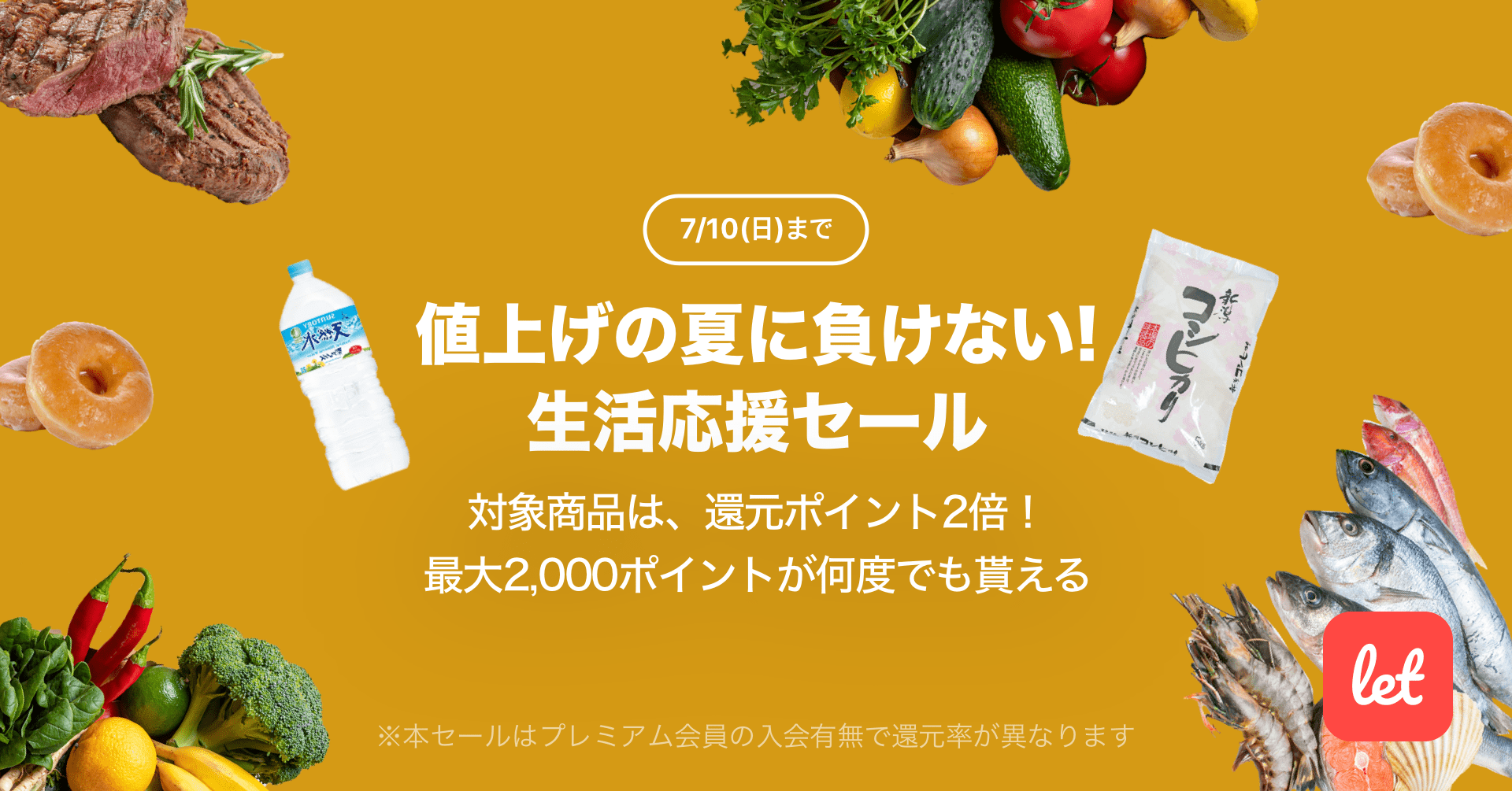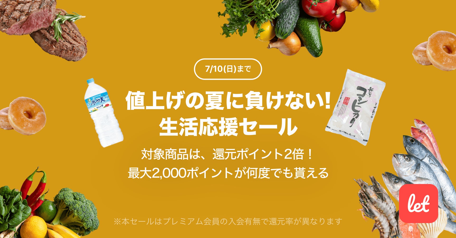 株式会社レット(本社:東京都港区、代表:佐藤 航陽)が運営する、食品ロス/在庫ロス削減のマーケット「Let(レット)」内で「値上げの夏に負けない!生活応援セール」を7月8日(金) 18:00より開催します。期間中、プレミアム会員様限定で対象の食品をご購入いただくと、2,000ポイントを上限に還元ポイントが2倍になります。期間中のご購入であれば、ポイント還元はお一人様あたり何度でもご利用いただけます。