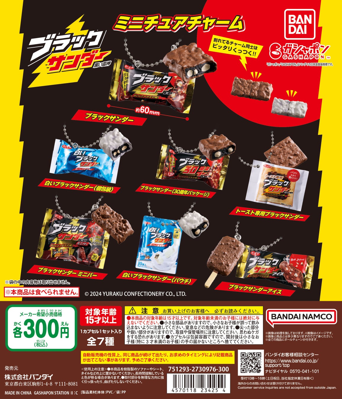 有楽製菓株式会社(本社:東京都小平市、代表取締役社長 河合辰信)が展開するチョコ菓子「ブラックサンダー」シリーズのガシャポン®「ブラックサンダー ミニチュアチャーム」(1回300 円・税10%込、全7種)が株式会社バンダイ (本社:東京都台東区)より、2024年12月第2週から全国のガシャポンバンダイオフィシャルショップ、玩具売場、量販店、家電店などに設置されたガシャポン自販機シリーズにて発売されます。