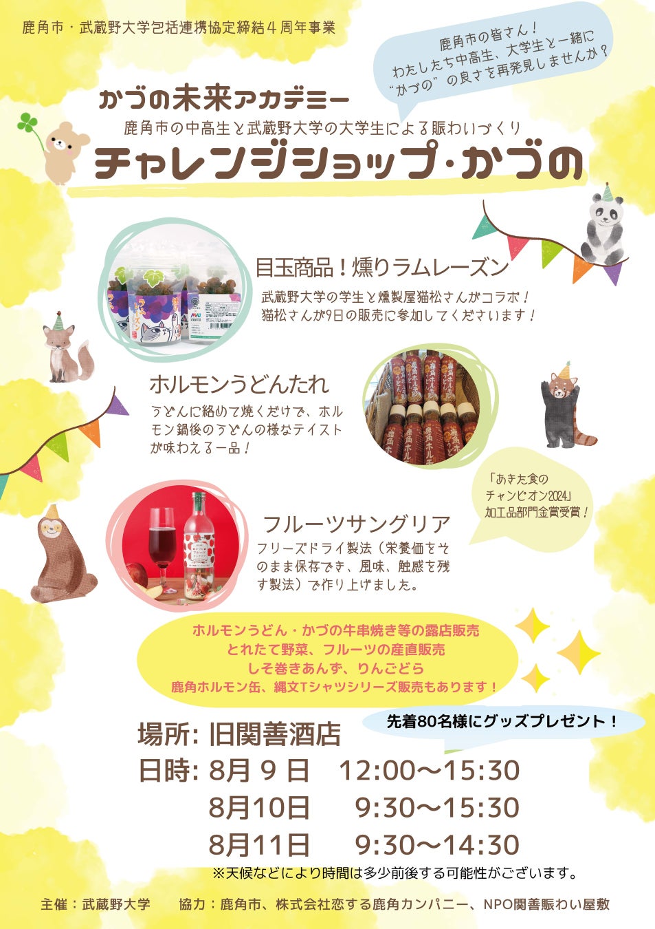 武蔵野大学(本部:東京都江東区 学長:西本 照真)の学生8名と秋田県鹿角市(市長:関 厚)の中高生10名は8月9日(金)~11日(日)の3日間、鹿角市内にある国の登録有形文化財「旧関善酒店」で「チャレンジショップ・かづの」を開催します。