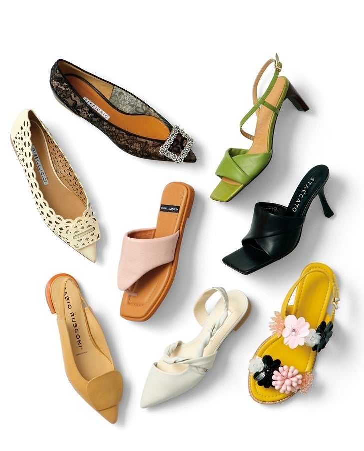 花のビーズが目を引くサンダルや、この春再注目のスクエアトゥ、ポインテッドトゥのパンプスなど、多彩なアイテムが勢揃い。ハッピーな気分になるトレンドシューズをお届けします。