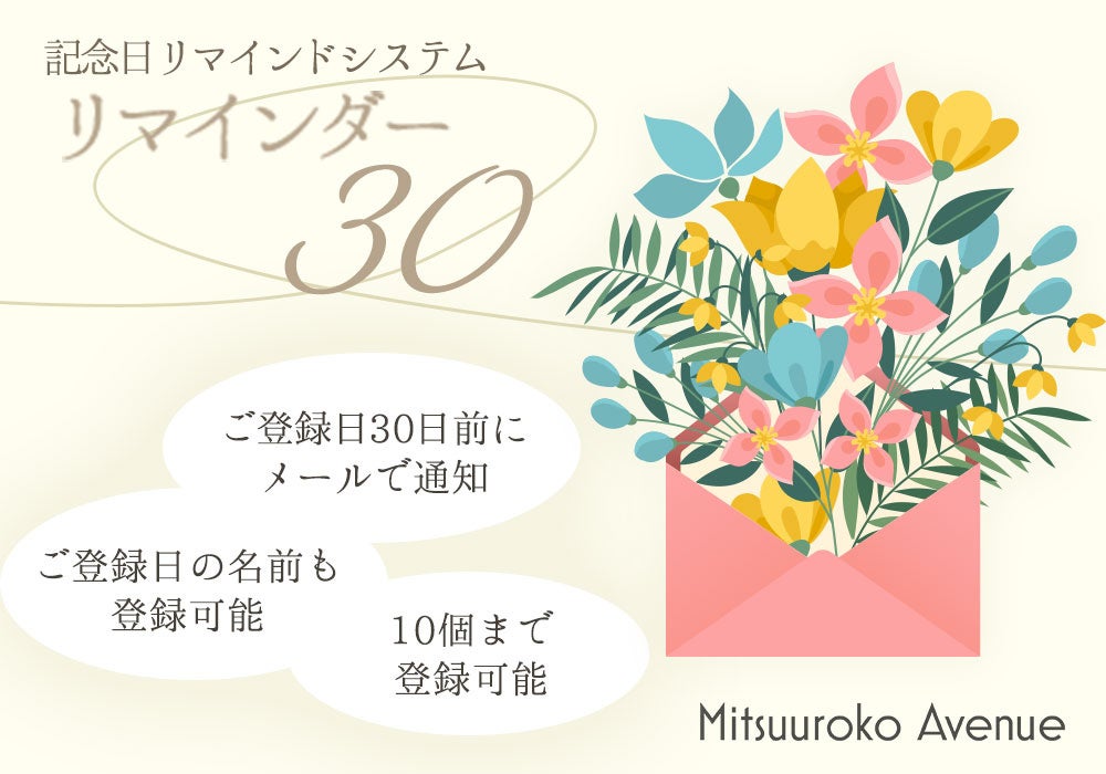 くらしのセレクトショップ・ミツウロコアベニューにて、忘れたくない大切な日のお知らせを行うサービス『リマインダー30』をリリースいたしました。ご登録を頂いた日の30日前にメールでお知らせをいたします。