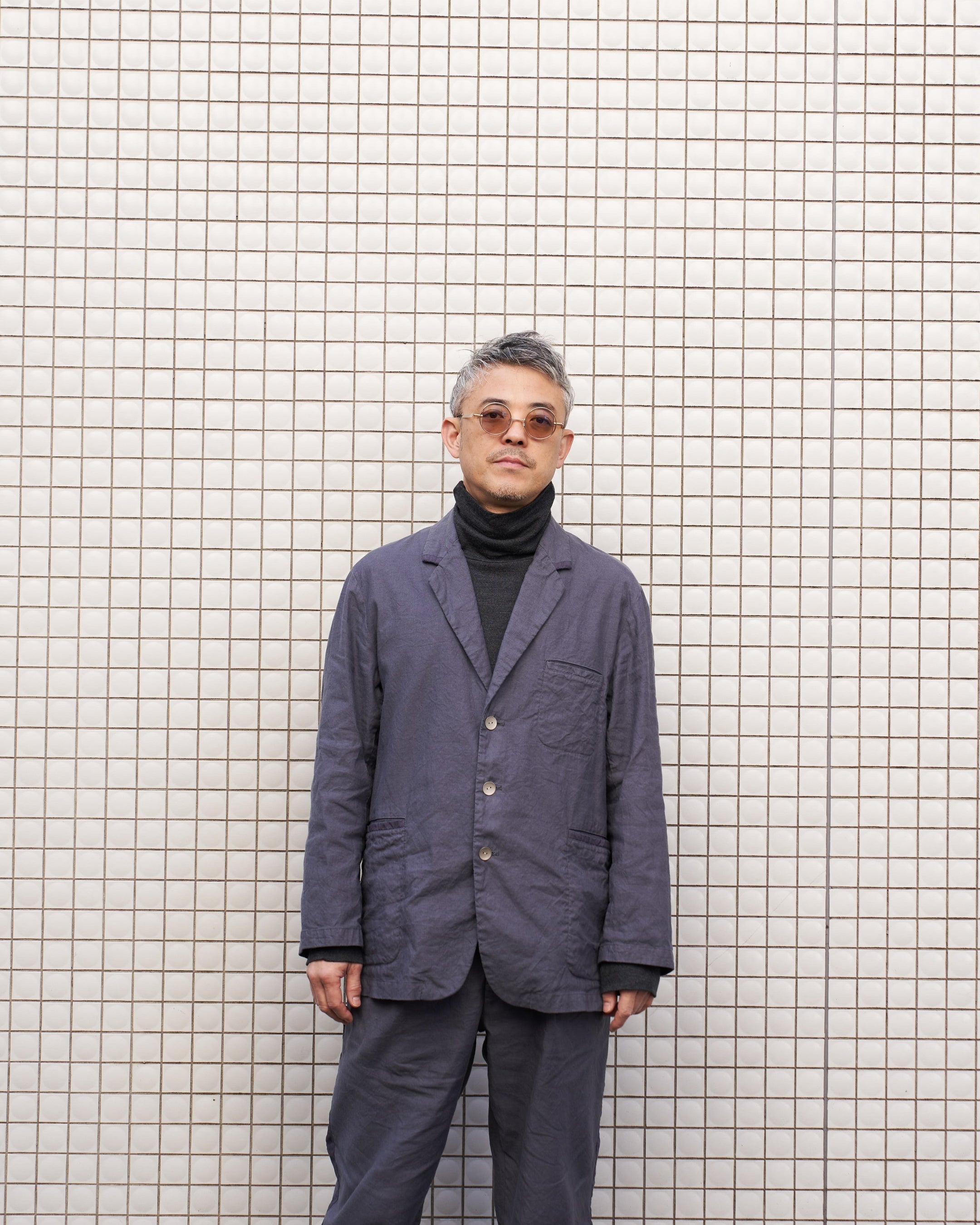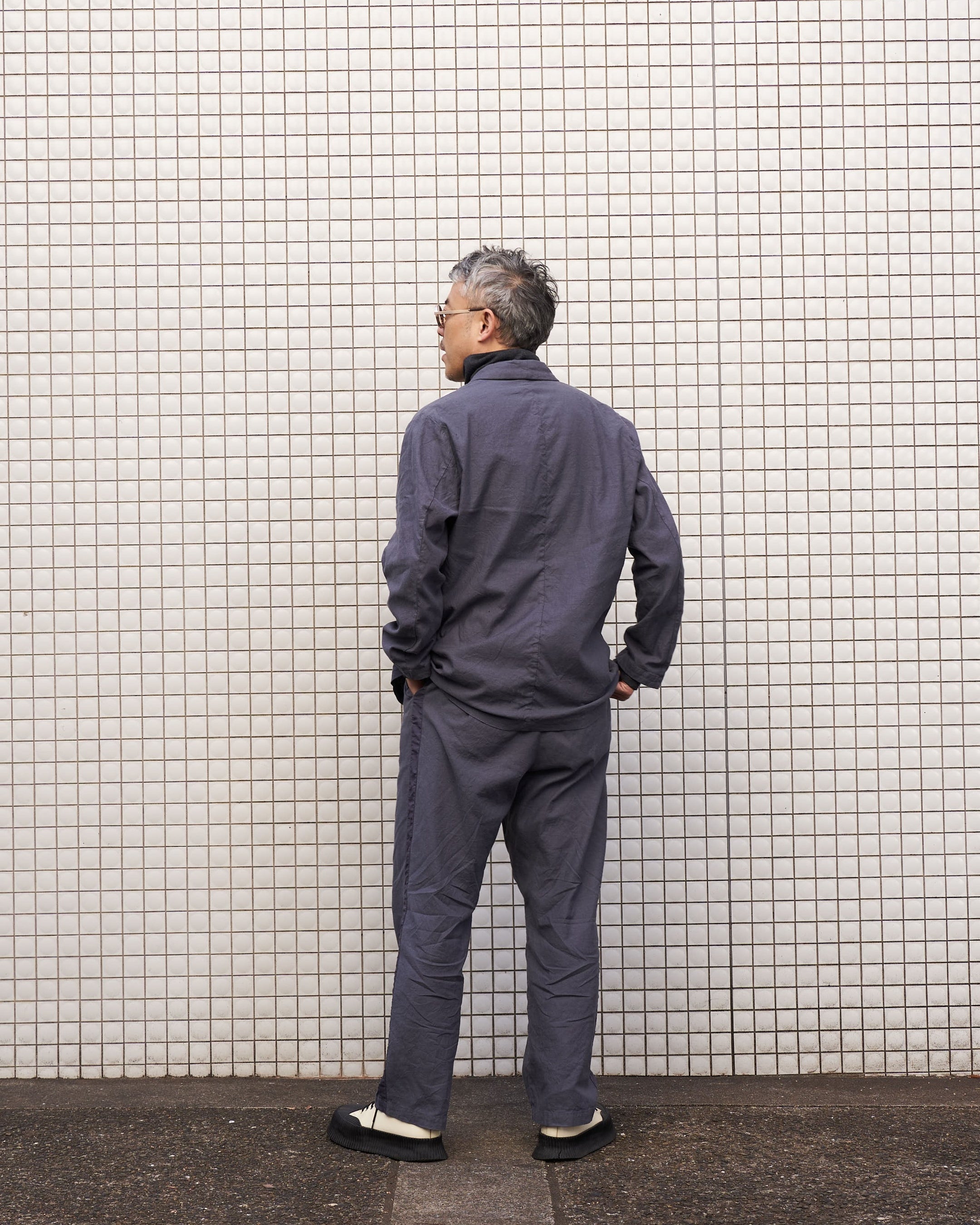 「キャッチワッシャー加工」を施した綿麻素材をメインに、艶感のある高密度のリネンをリボンテープのようにあしらったジャケットとトラウザーズ。製品染めを施すことで、素材によって染まり具合に差が生じ、色のコントラストがアクセントになっております。 数量限定でシルバー調のメタル釦を使用した「LIMITED ver」をご用意。フラットでシャープ、そしてマットな質感が全体に馴染みながら、存在感を与えてくれるシルバー釦の特別仕様となっております。