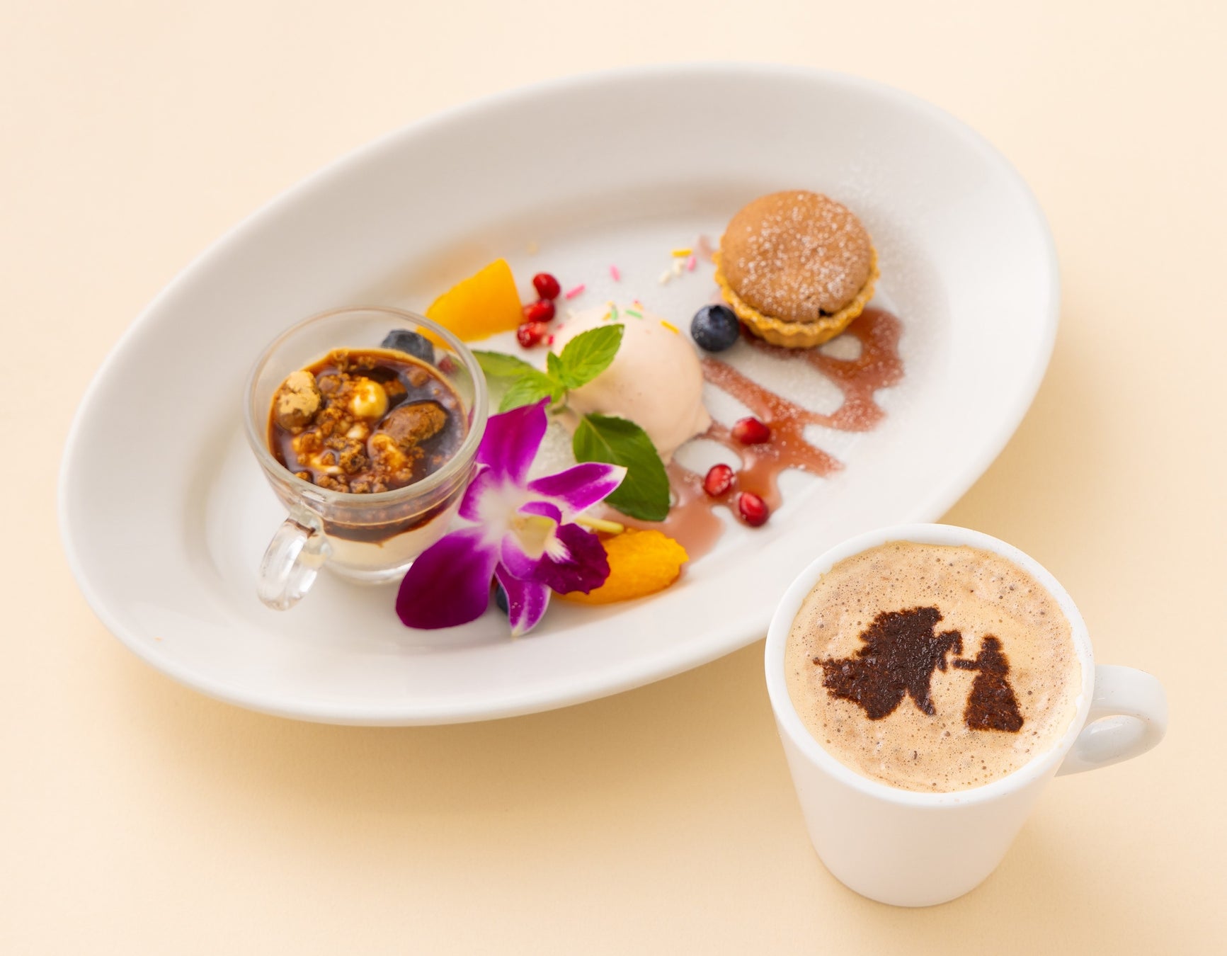 メインビジュアルのシルエットをあしらったカフェラテと特別デザート盛合せのセットです。